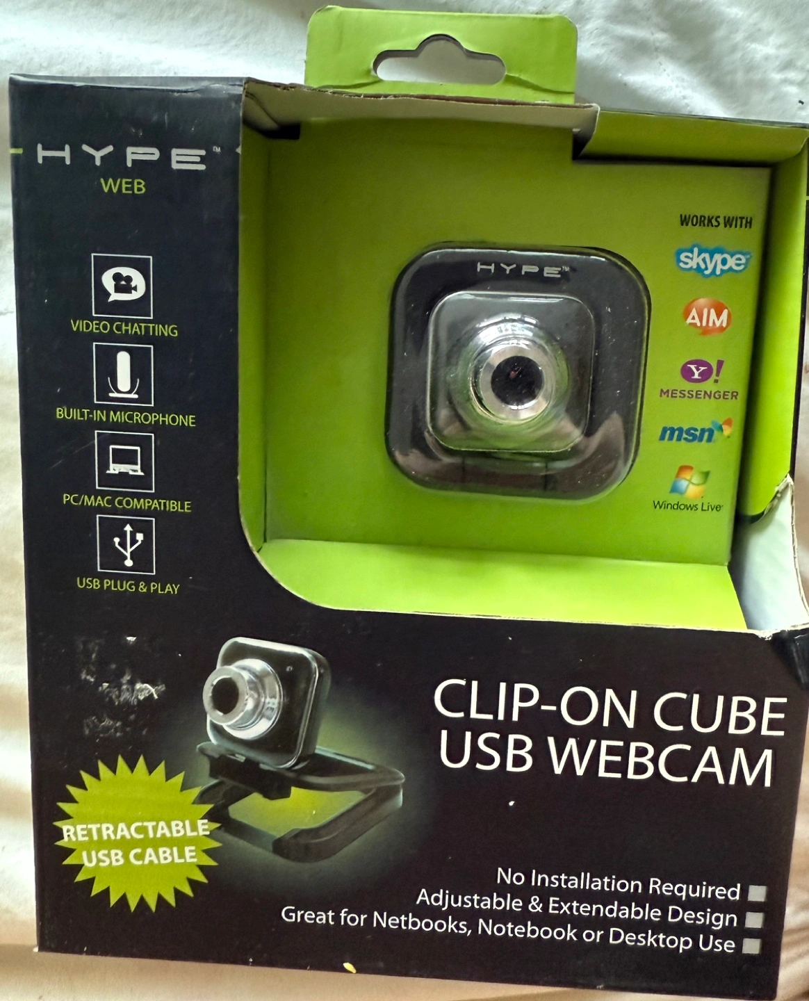 Clip-on cube webcam with built-in microphone, retractable USB cable. PC/Mac compatible. Works with Skype, AIM, Yahoo Messenger, MSN Messenger, Facebook, ICQ and more.