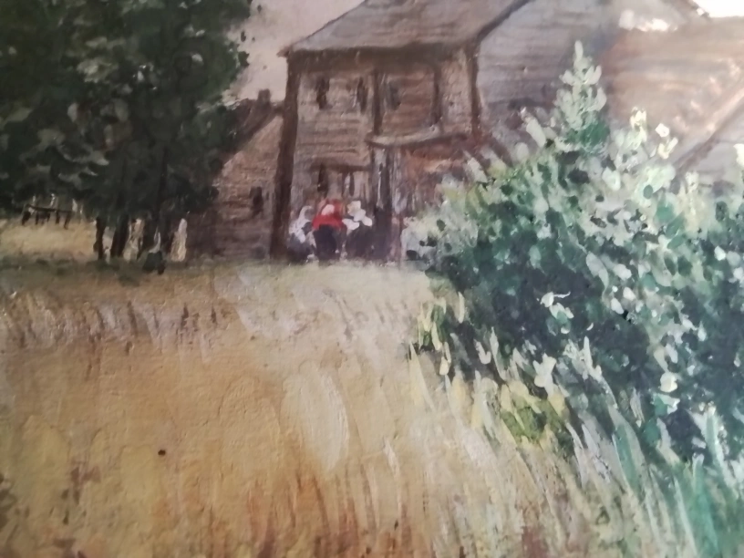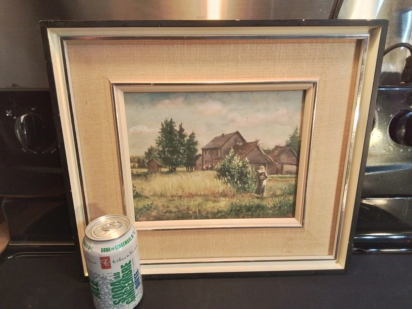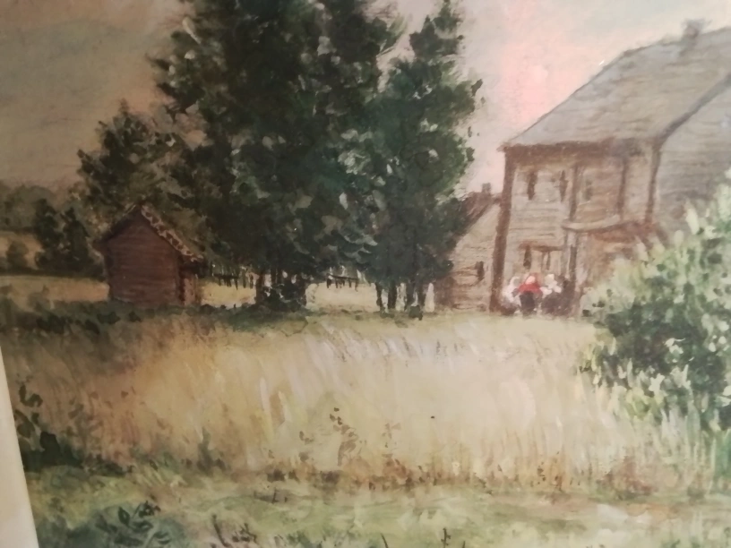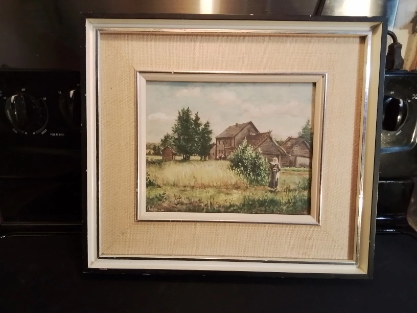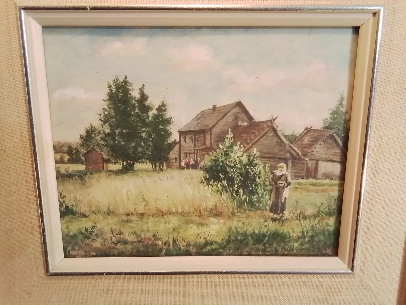 114Framed Original Russian Watercolor Painting by Rozov 1966 Framed painting depicting a rural scene with a woman standing near a wooden house. Signed by the artist Rozov (Розов), May 1966. Measurements Frame approx 16 x 14, Image 10 x 8 Pickup at Young Street and Steels Ave