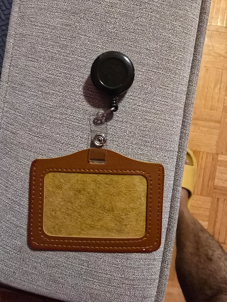 407Brown leatherette ID badge holder with a retractable clip. It has a clear window for inserting an ID card.