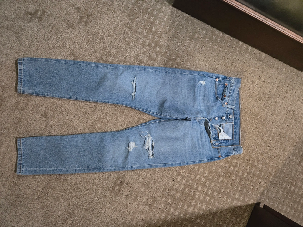 168Light wash denim jeans with distressing. Five pocket style with button fly. Waterless technology
