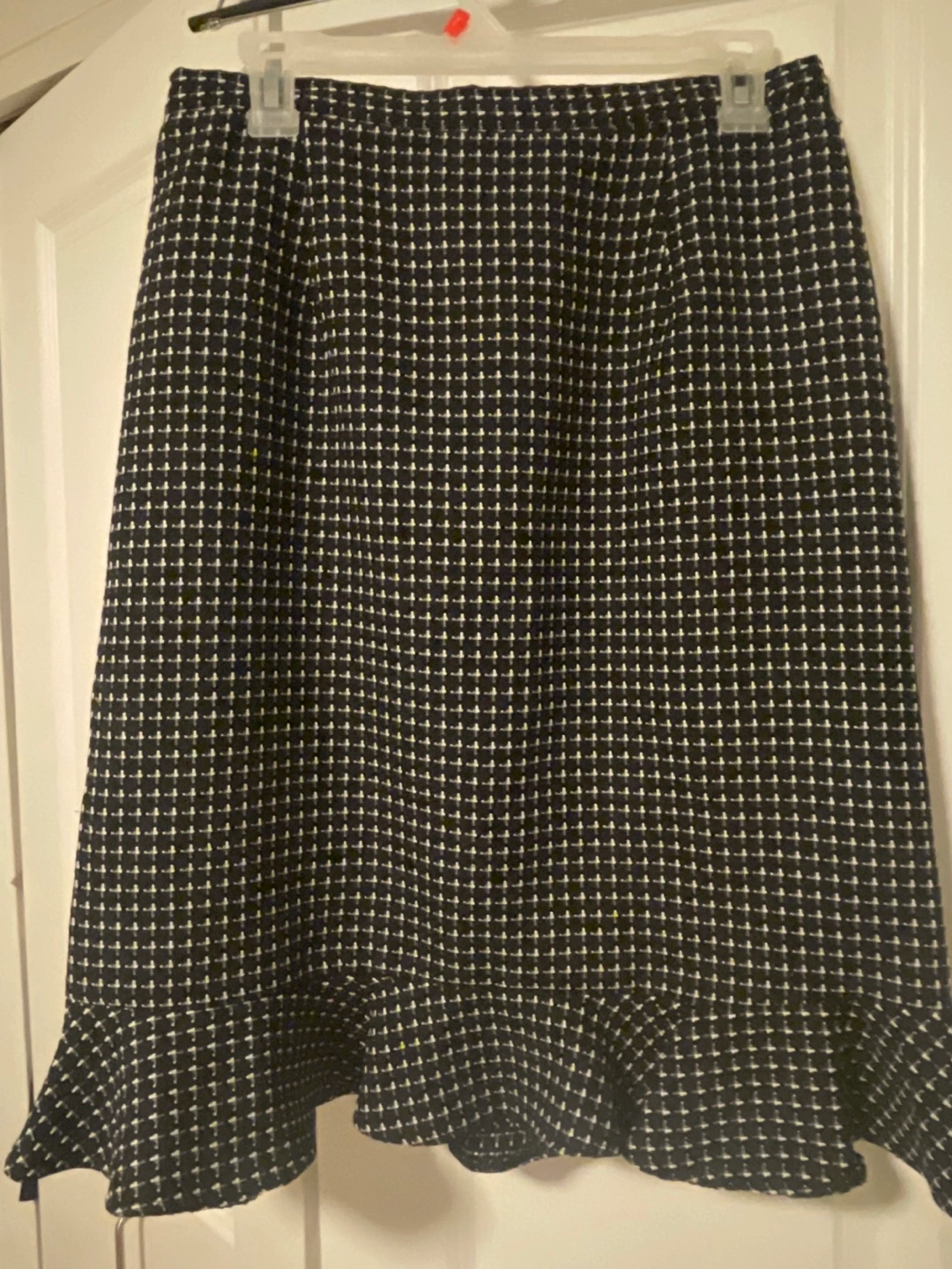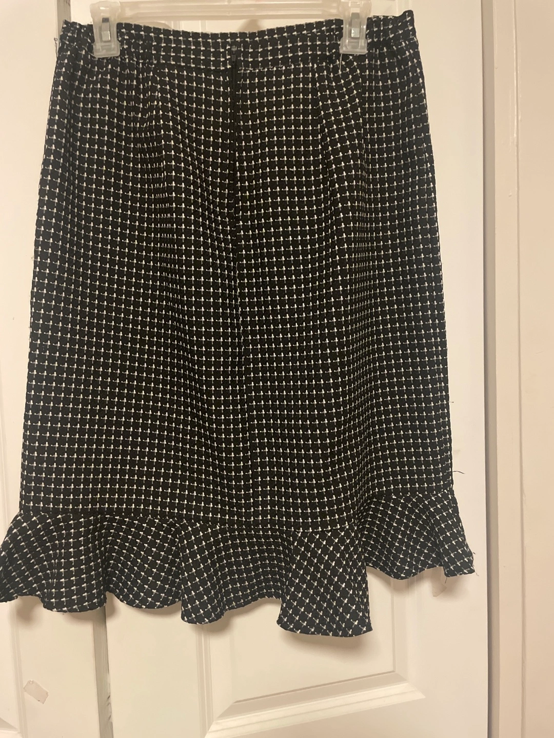 84Black and white skirt with a ruffle hem. The skirt is a size 10.