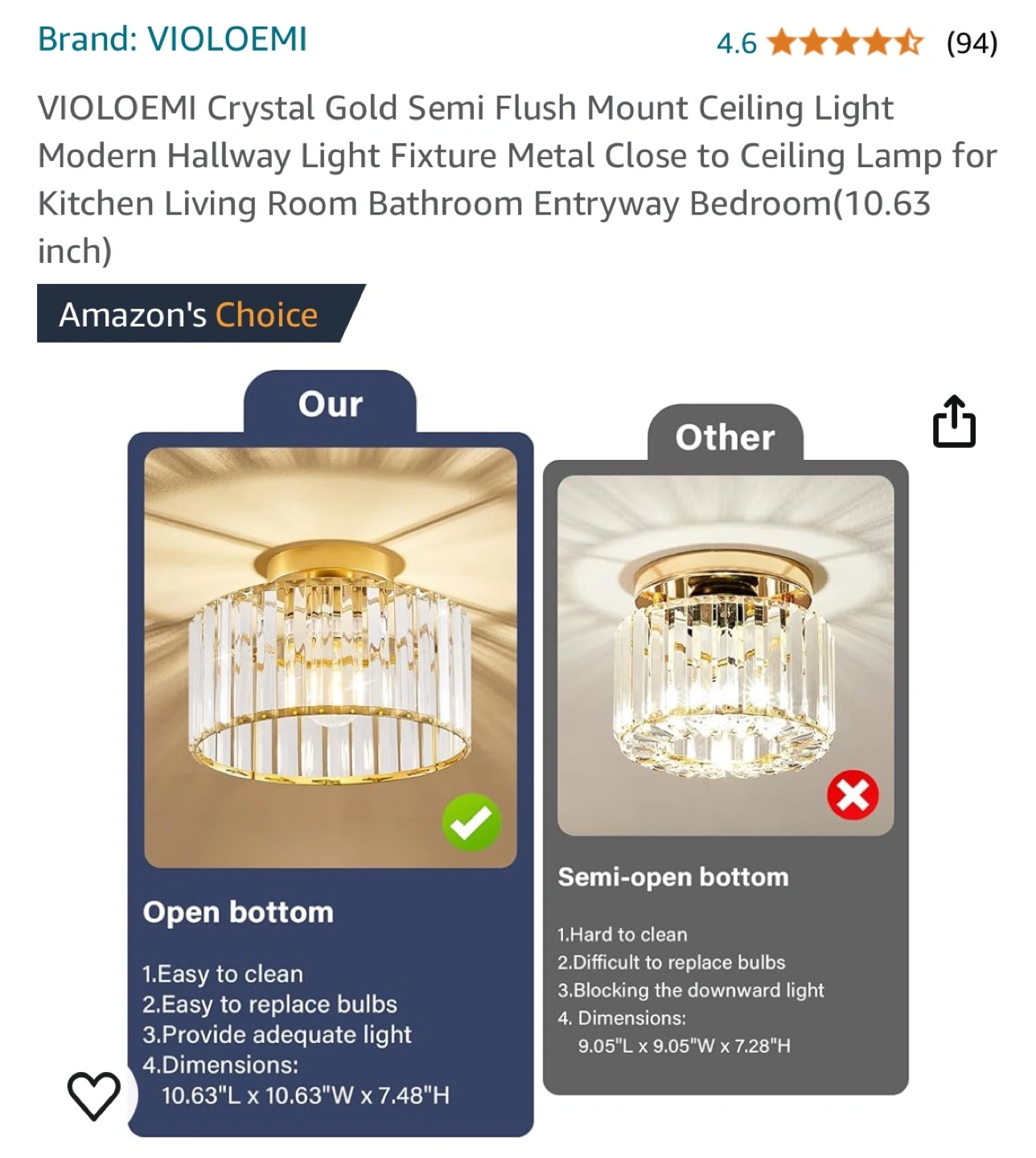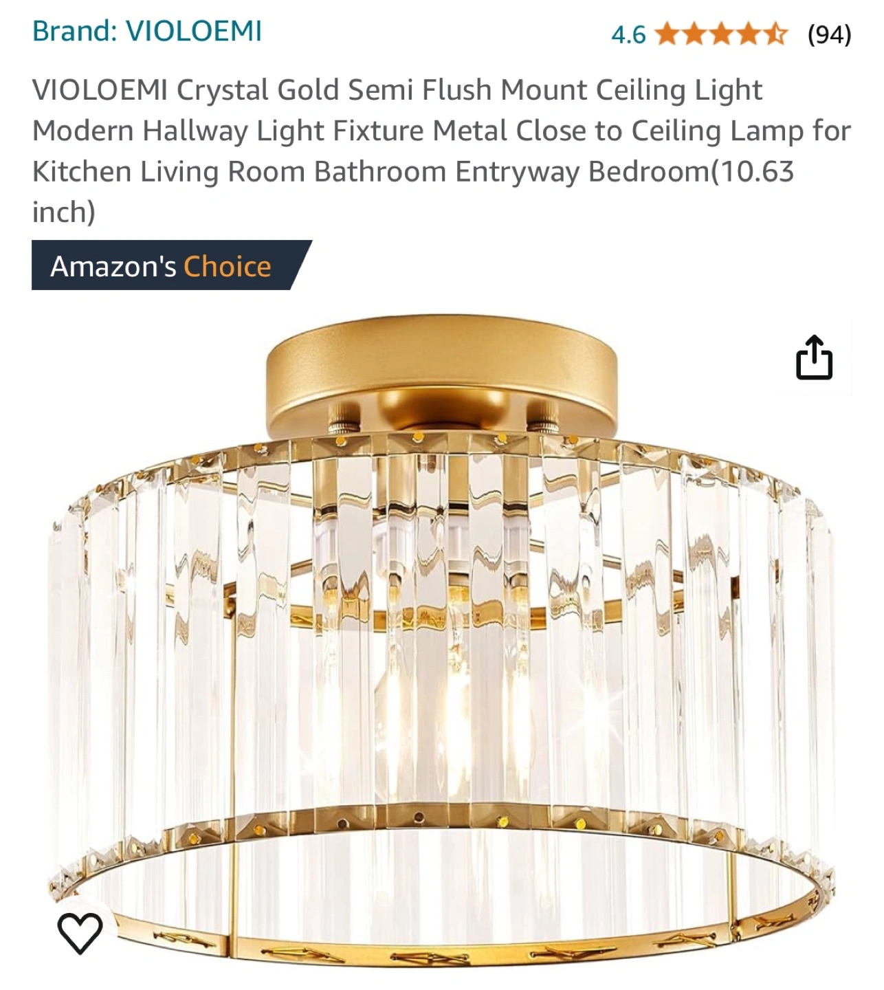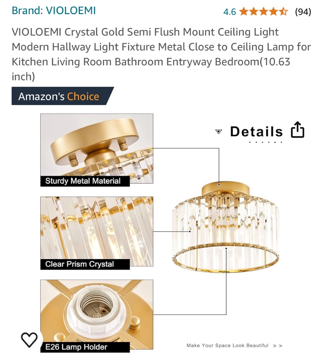 145Gold semi-flush mount ceiling light fixture with clear crystal accents. Open bottom with an E26 bulb socket.