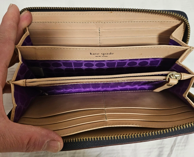 Green crocodile embossed leather wallet with zipper closure and multiple card slots. Includes a zippered coin pouch.