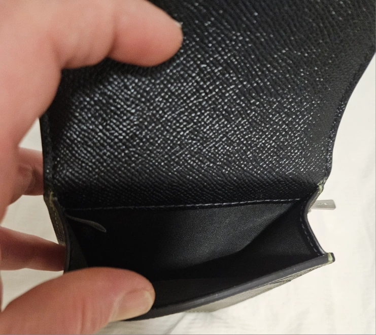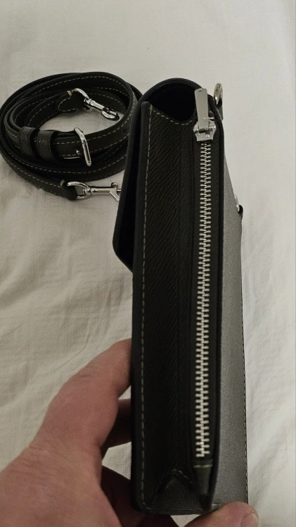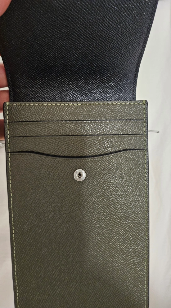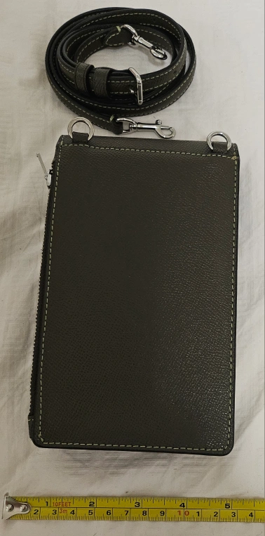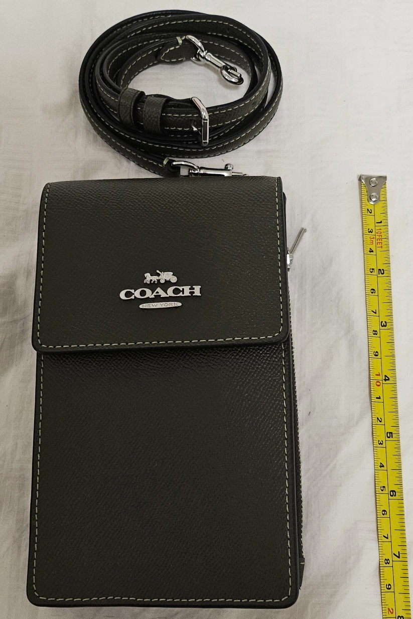 Green leather Coach crossbody phone bag. Has zipper closure and a long adjustable strap. Interior has several slots and a zipper pocket.