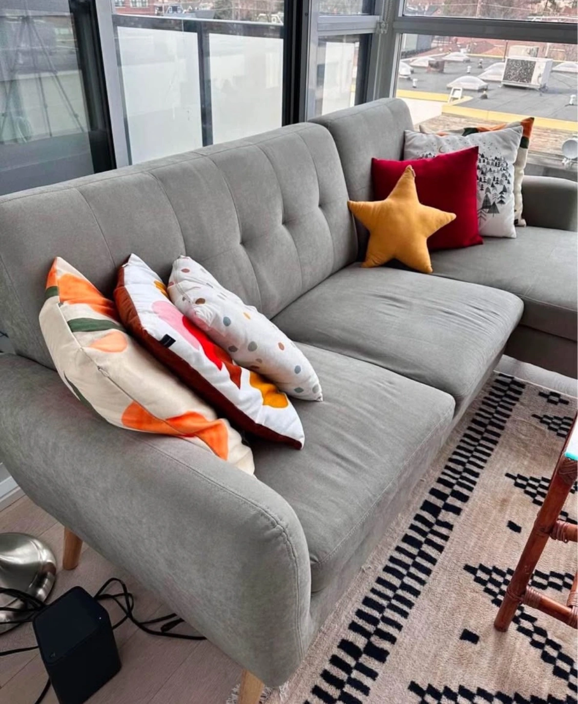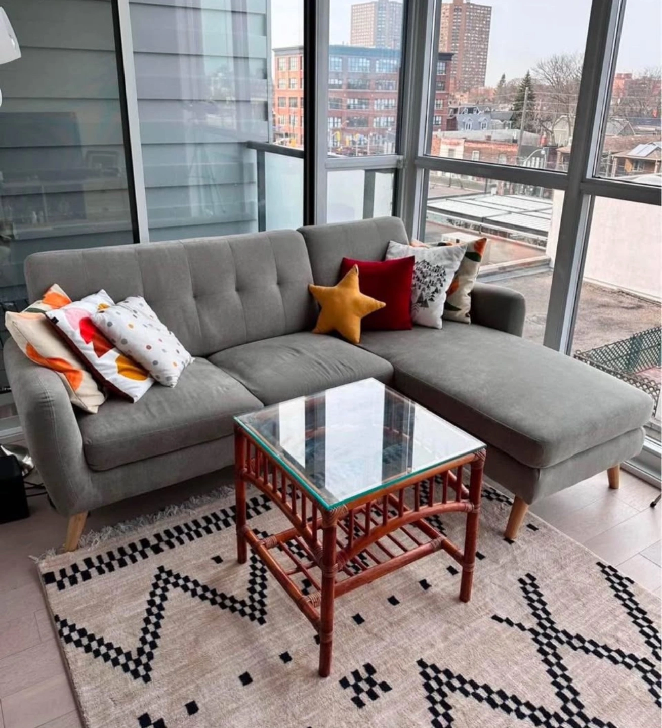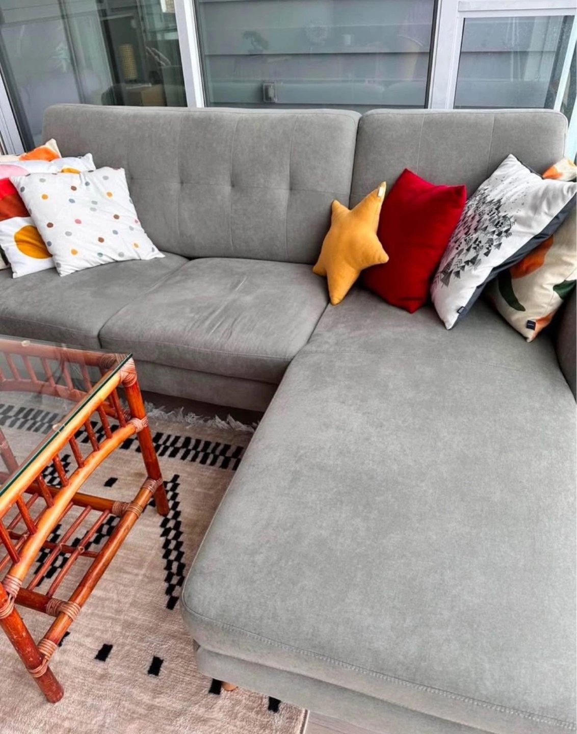 60Moving out, so I can’t take it with me. It’s been used for 2 years and in a good condition. Smoke, pet and kid free house. There is a small spot which happened after using a wrong cleaning product on the sofa. (The last photo) Other than that, there is nothing wrong with it. Width: 207 cm (81") Height: 83 cm (33") Depth: 151 cm (59") Only cash and pick up.