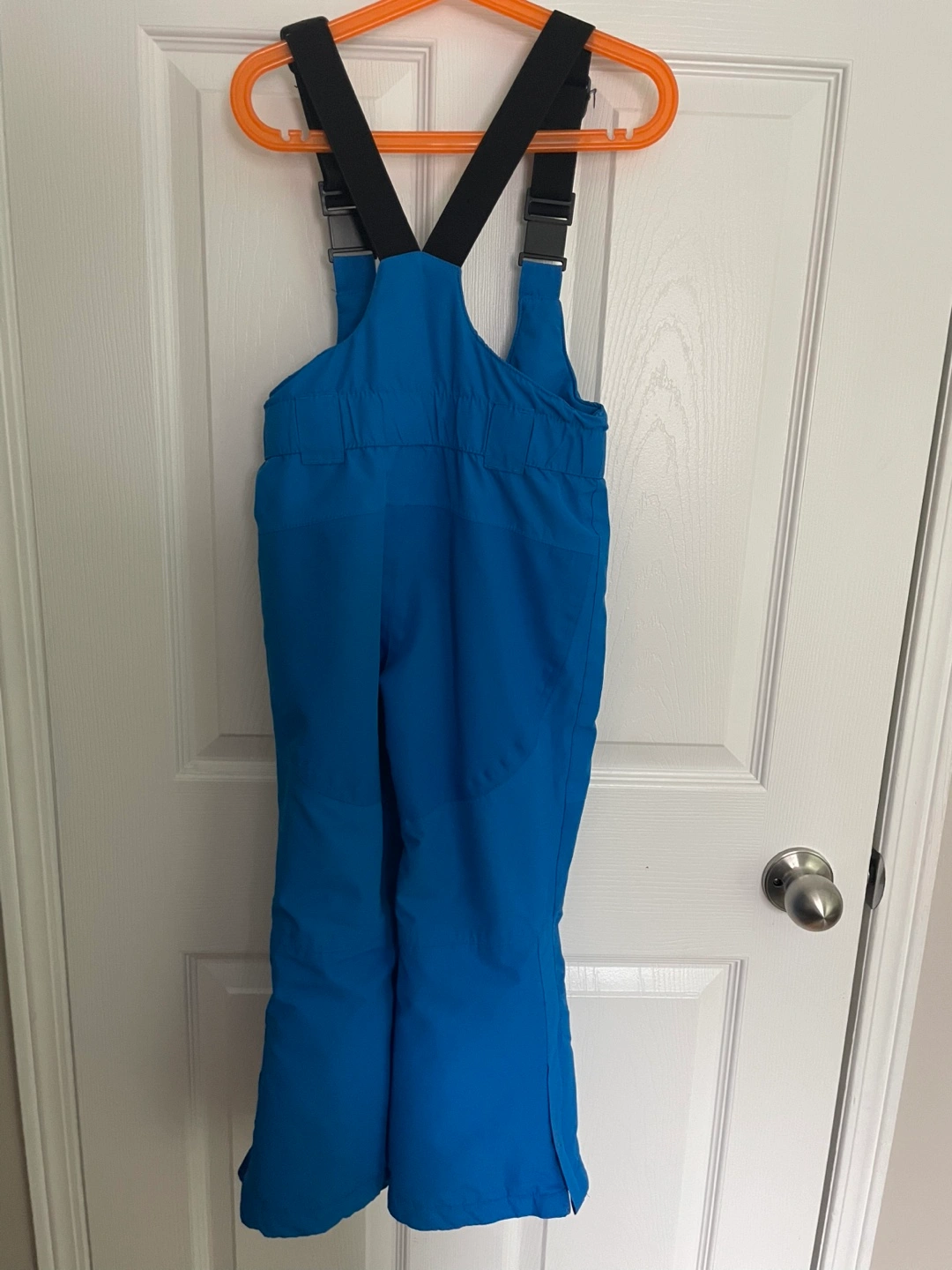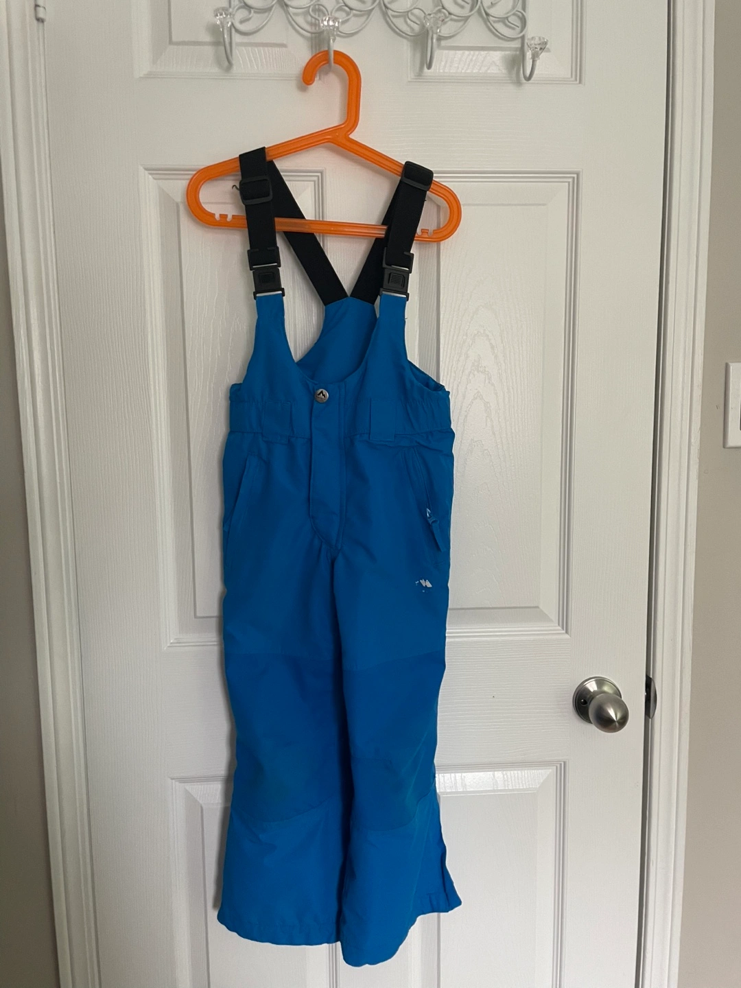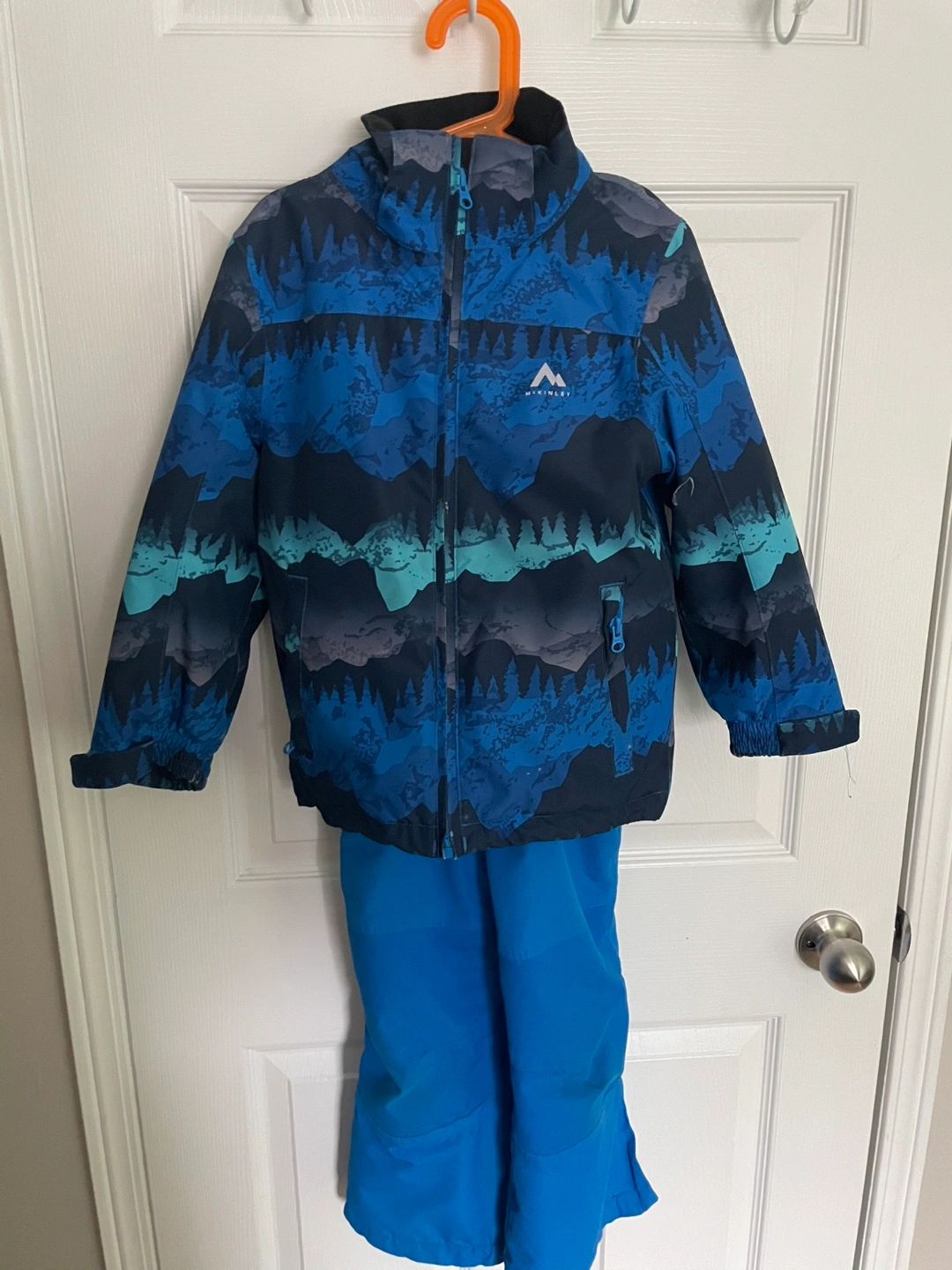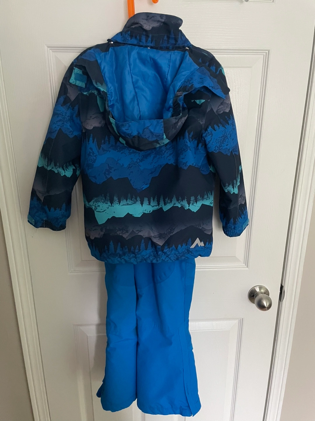 Blue ski suit with a mountain print. Includes jacket and bib overalls. Size 7.