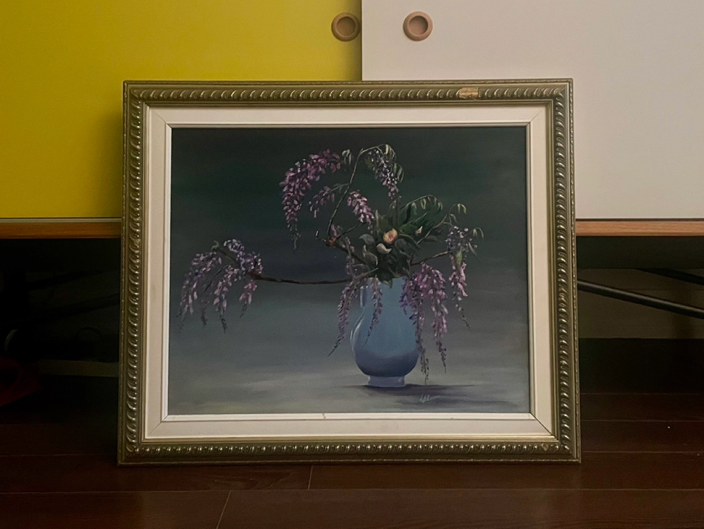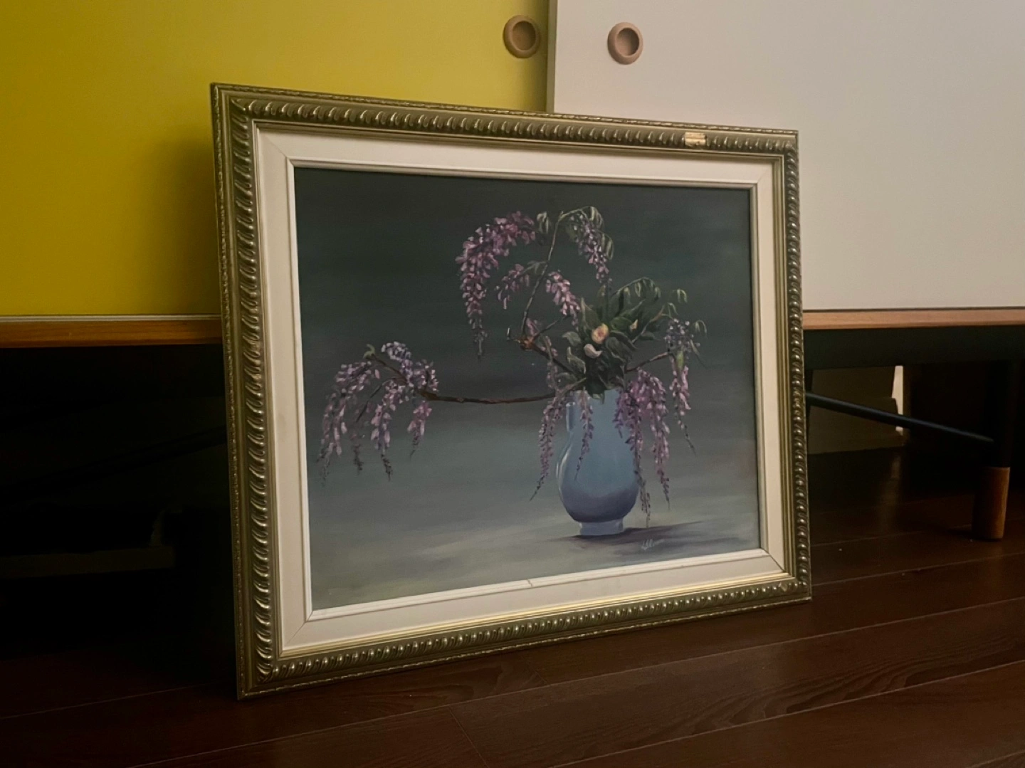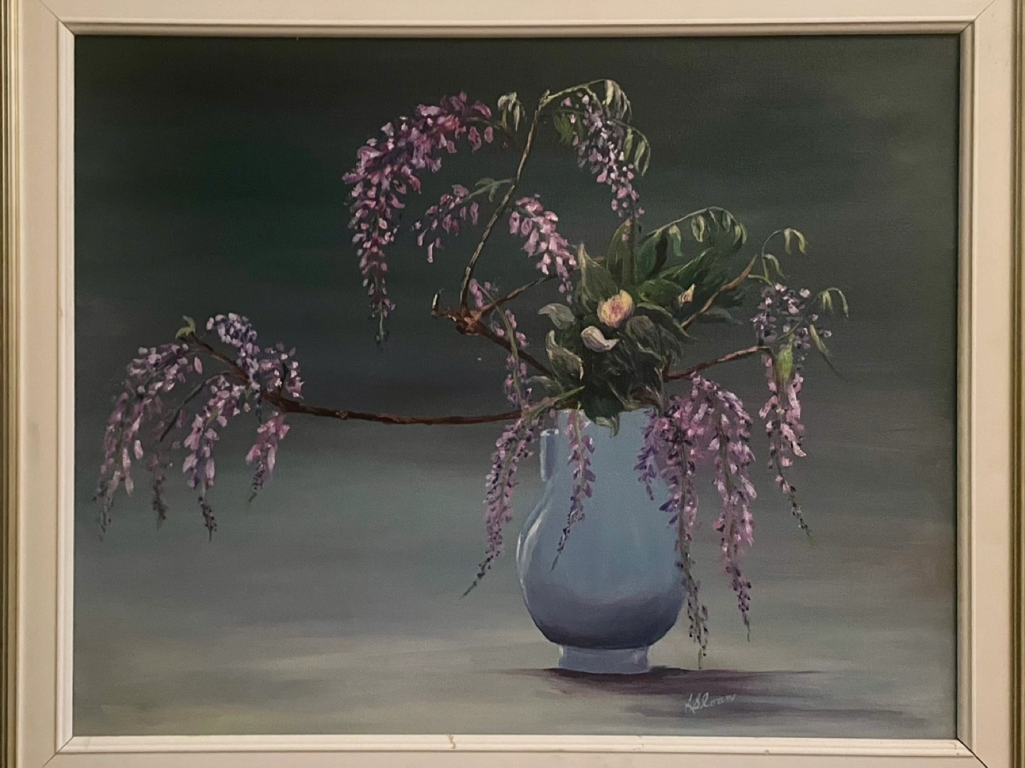 Vintage oil composition on canvas, signed lower right, depicting a delicate arrangement of purple wisteria blossoms draped over a light blue vase. The blossoms cascade gracefully, the overall mood is calm and serene, emphasizing simplicity and beauty. Small chip on the frame upper right, not noticeable when hung. 21” x 24 3/4” Pick up around Sherbourne/ Wellesley Could ship/ deliver for a fee
