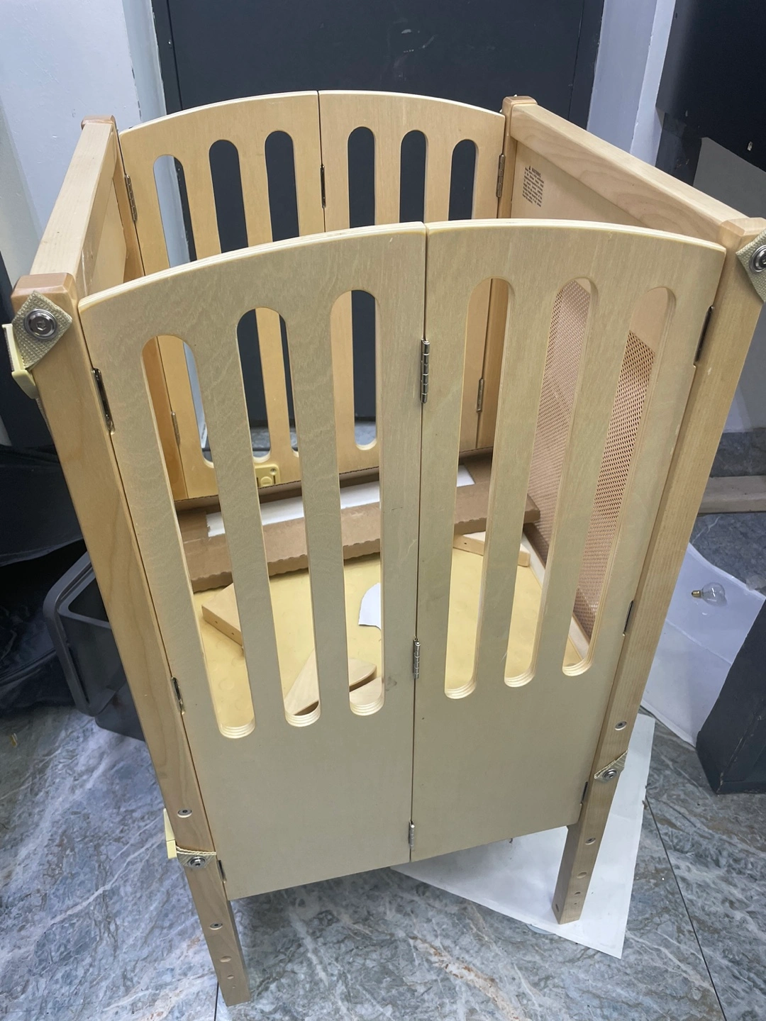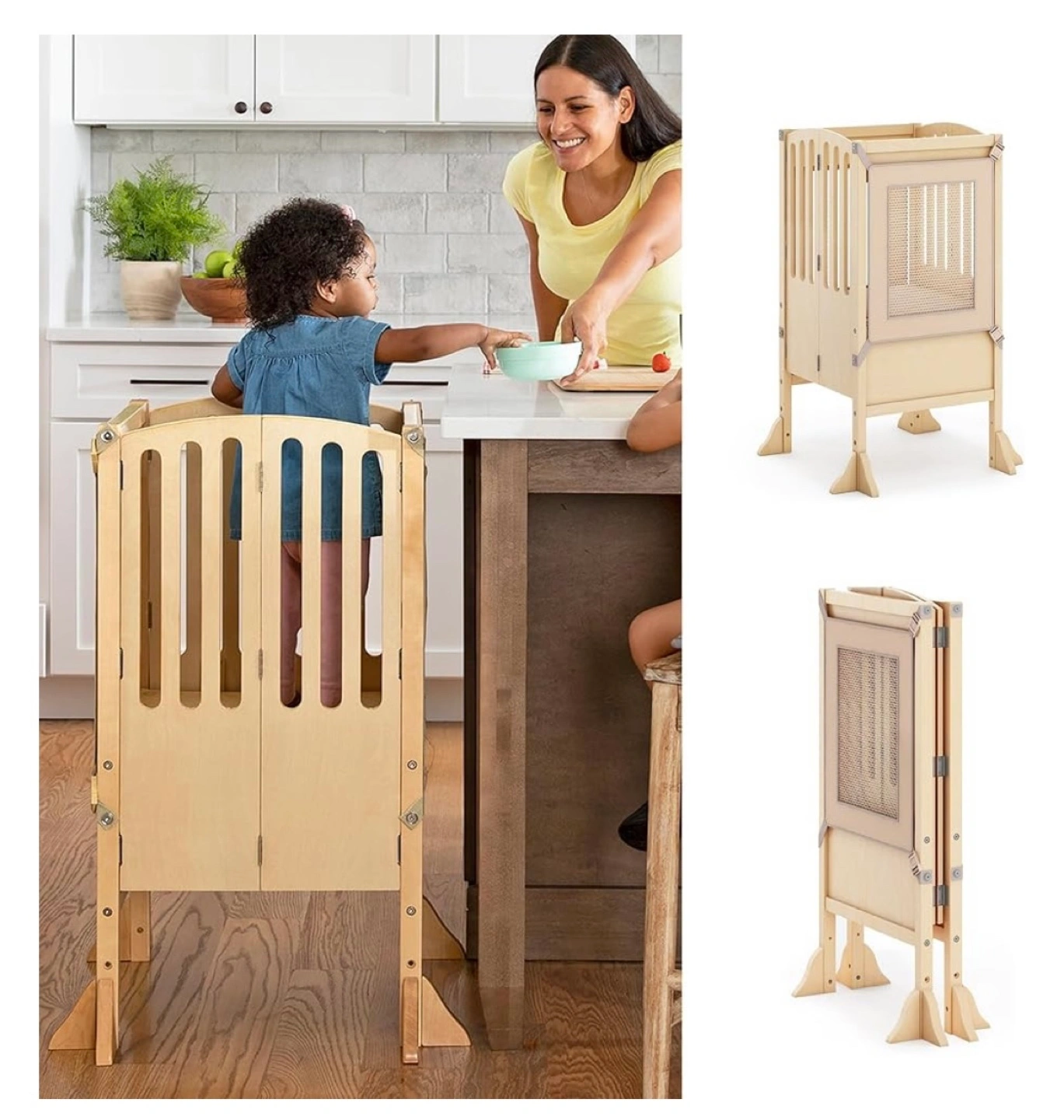 Natural wood learning tower. Great for toddlers and kids. Easy to assemble. Includes safety harness. Good condition.
