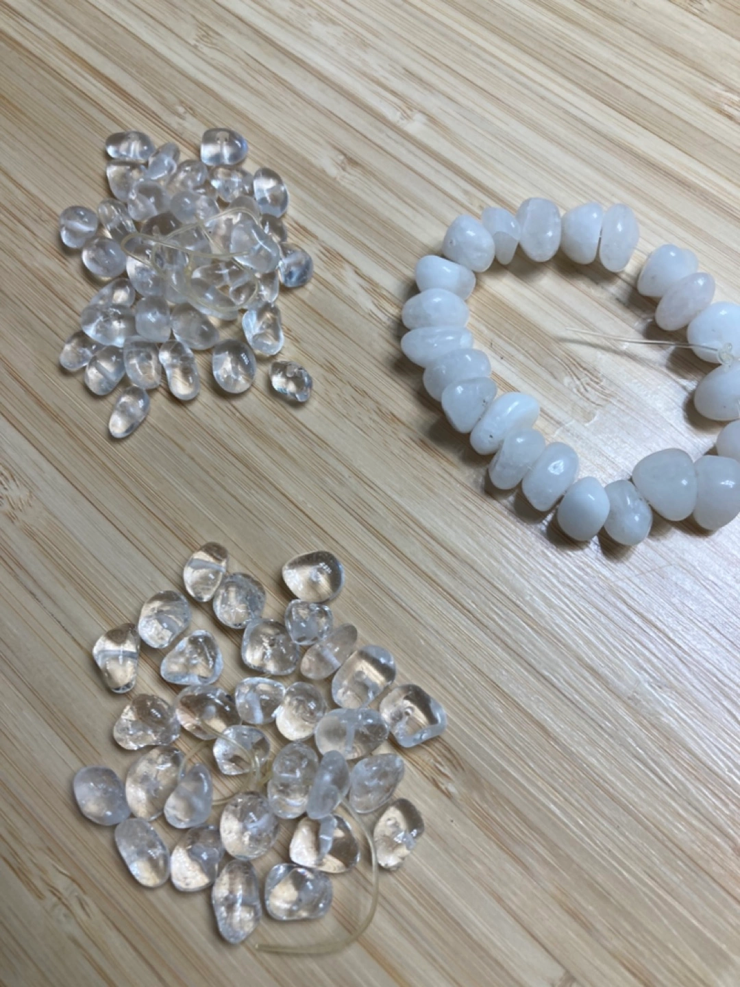 Calling all jewelry makers! Two sets of clear quartz crystal chips and one white quartz bead bracelet. The bracelet could afford to be restrung as well. $5 for the bundle.