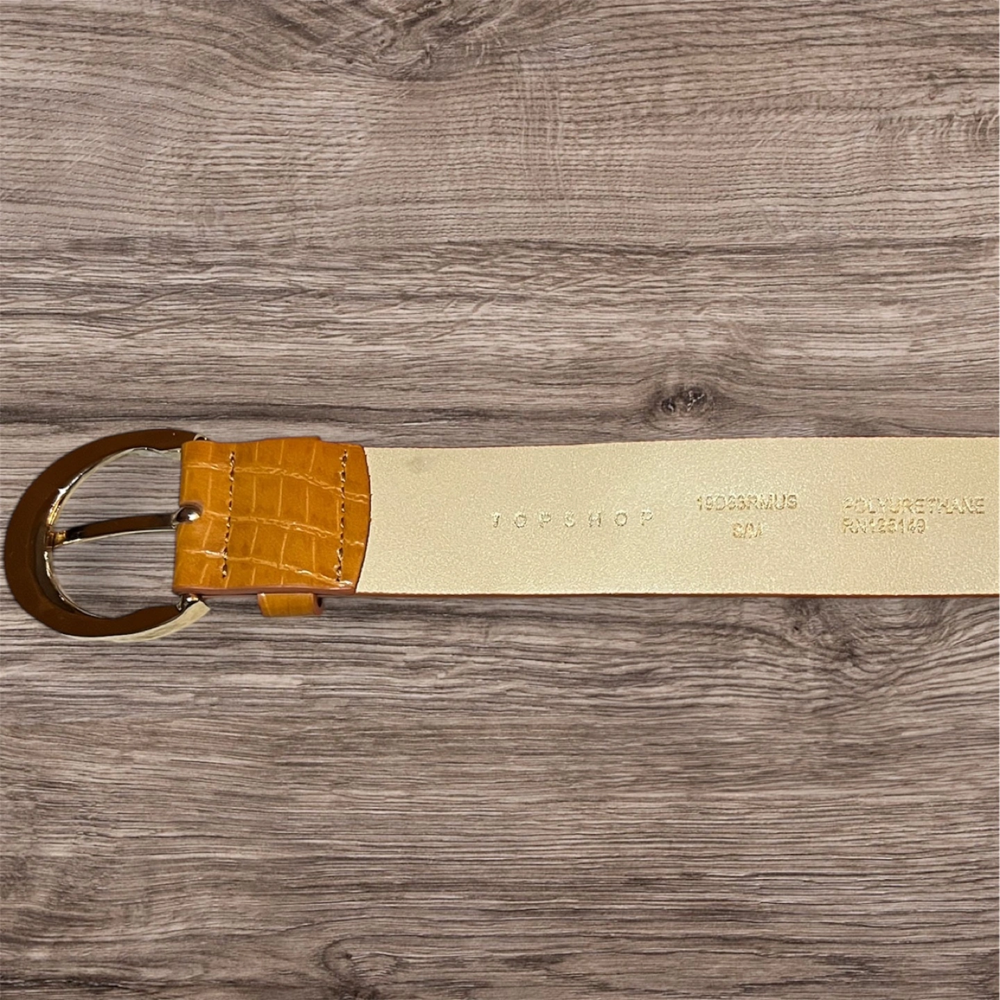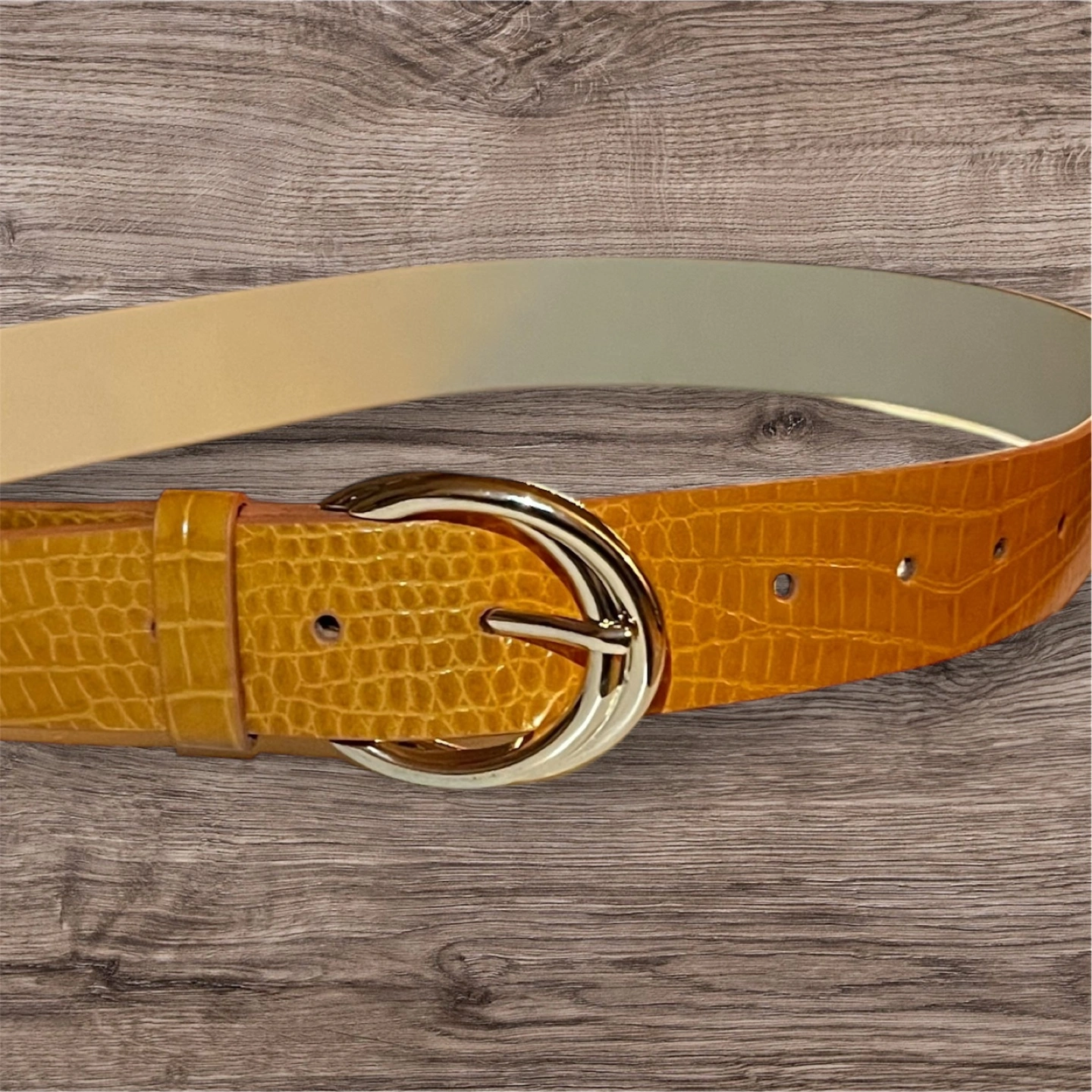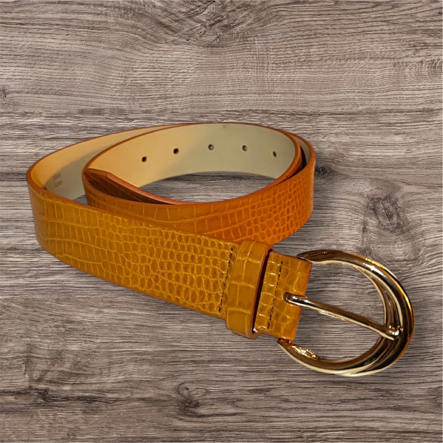 Crocodile embossed leather belt with gold buckle. New, never worn