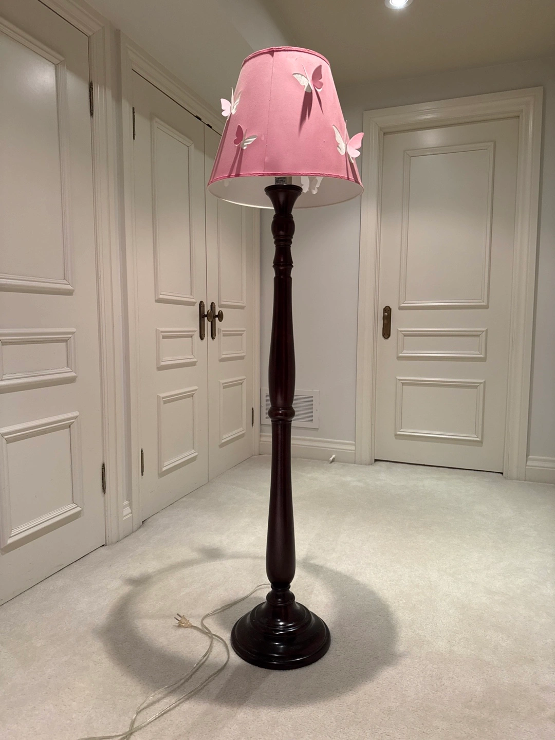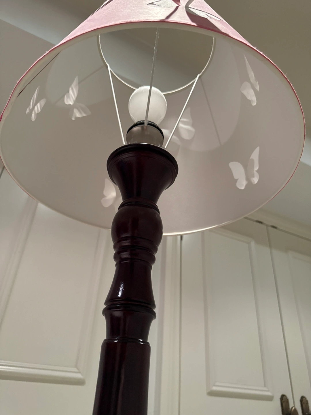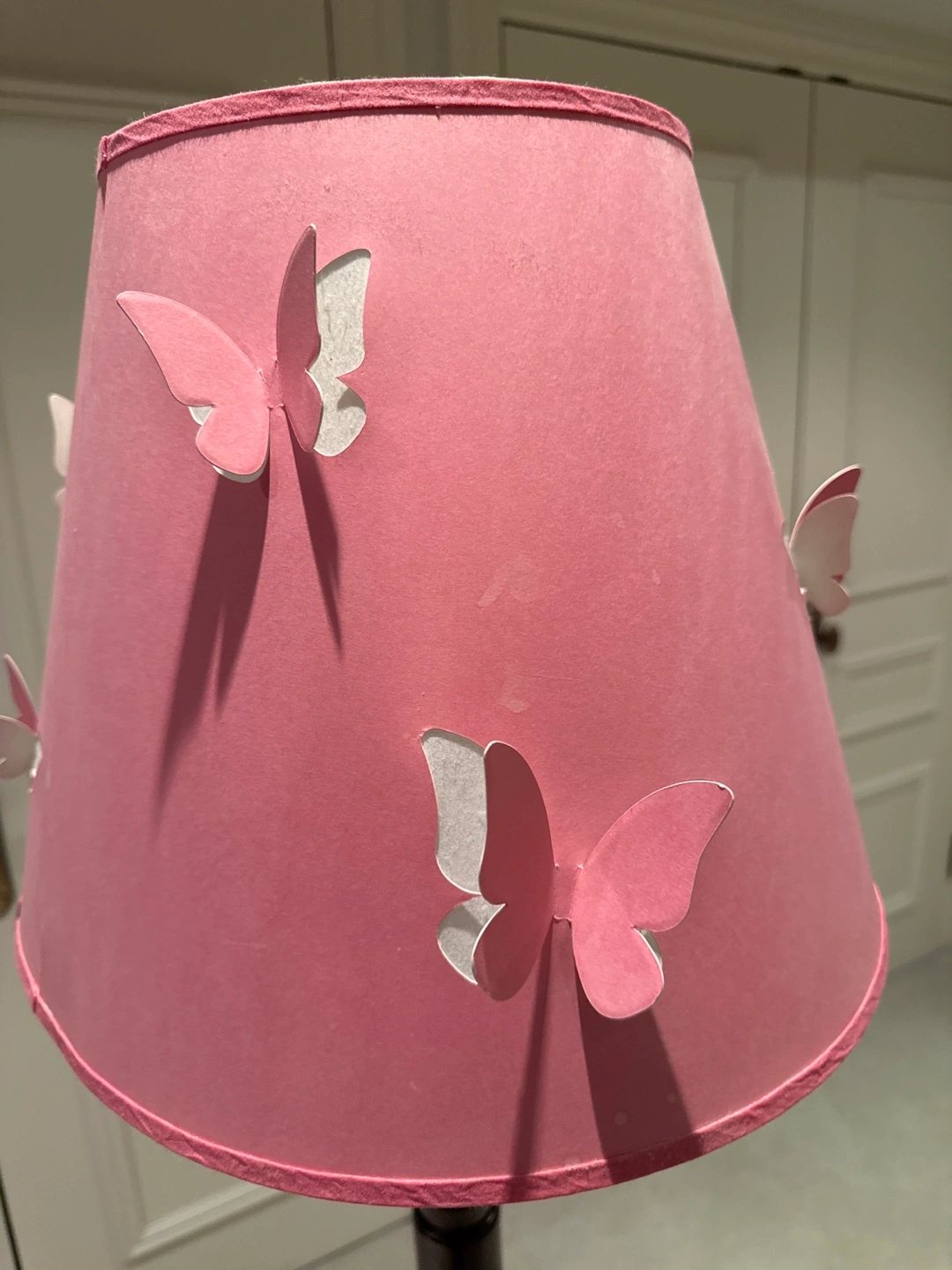 26Wooden floor lamp with a pink shade featuring butterfly cutouts from Pottery Barn Kids