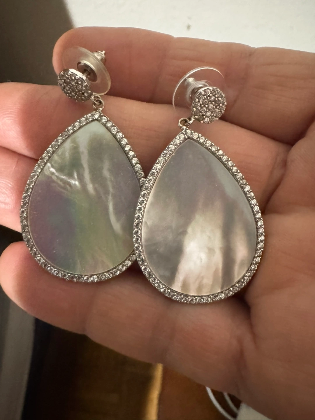 Silver teardrop earrings with a mother of pearl centre and a clear crystal border. Beautiful and sparkly!