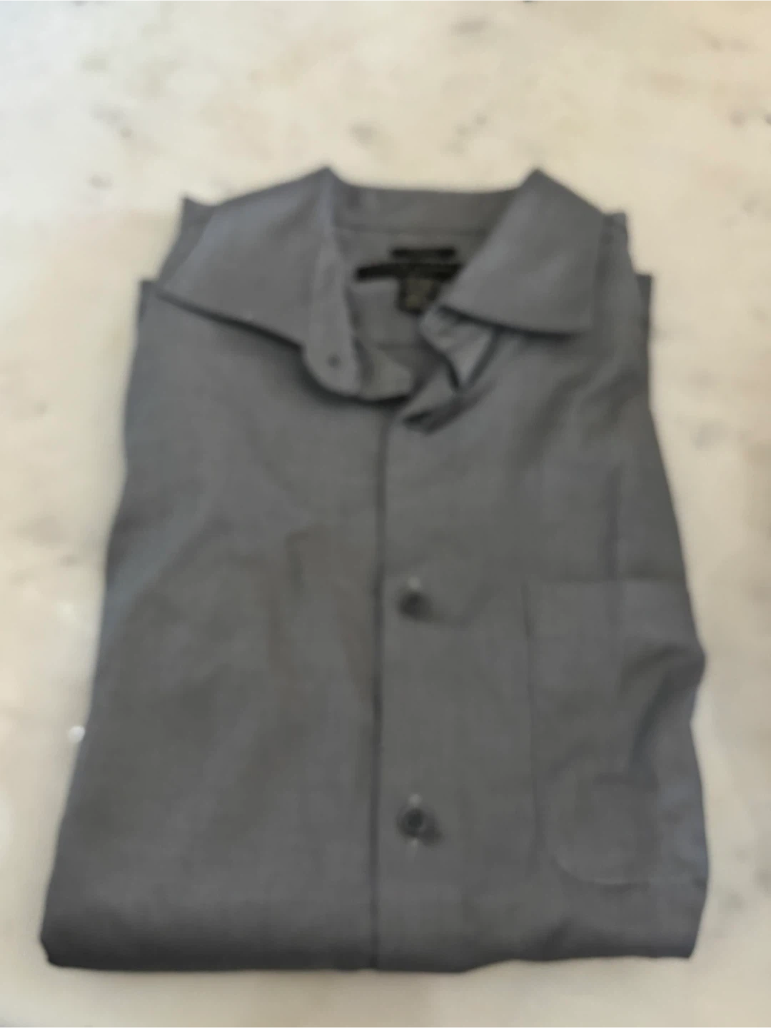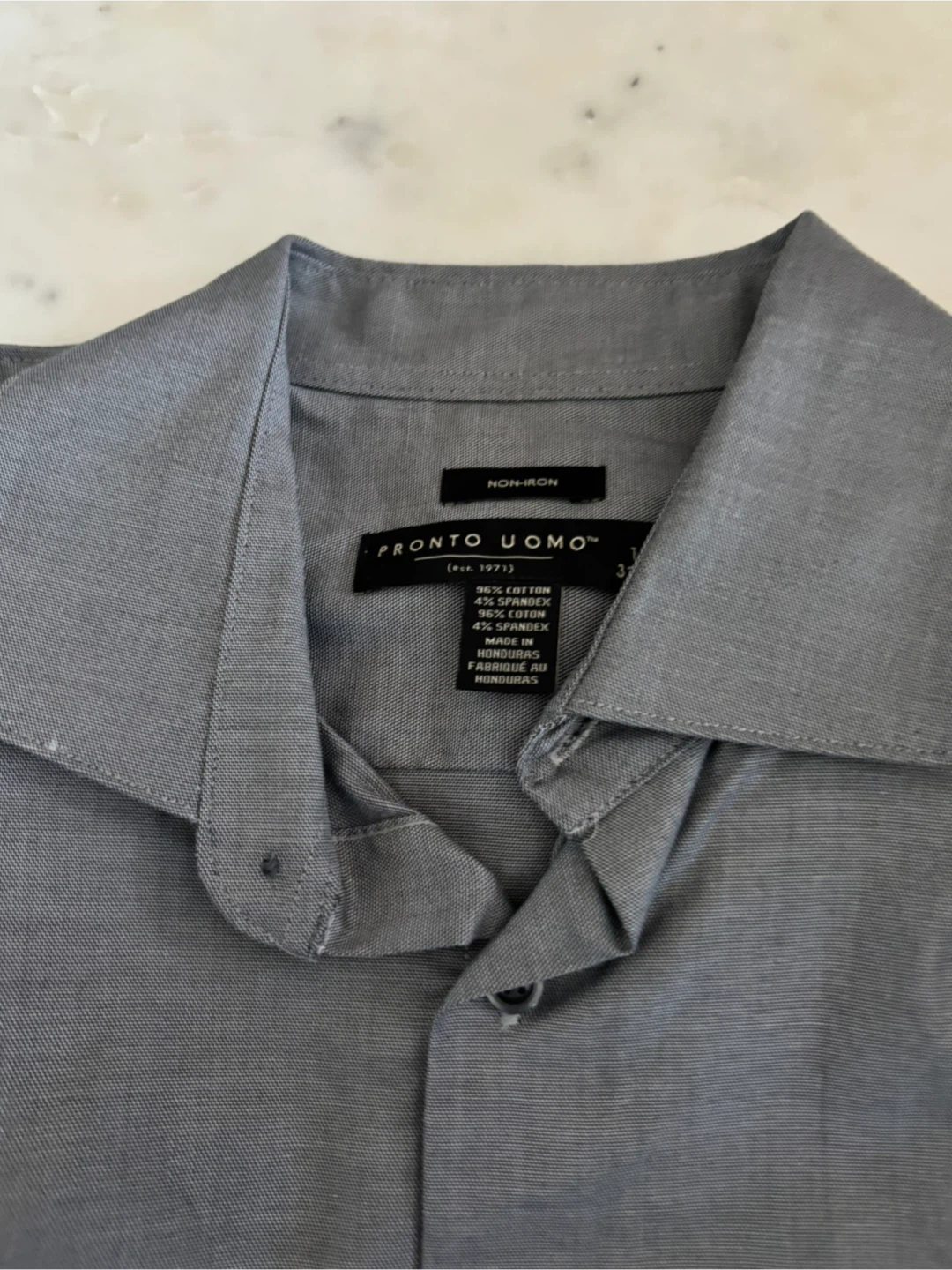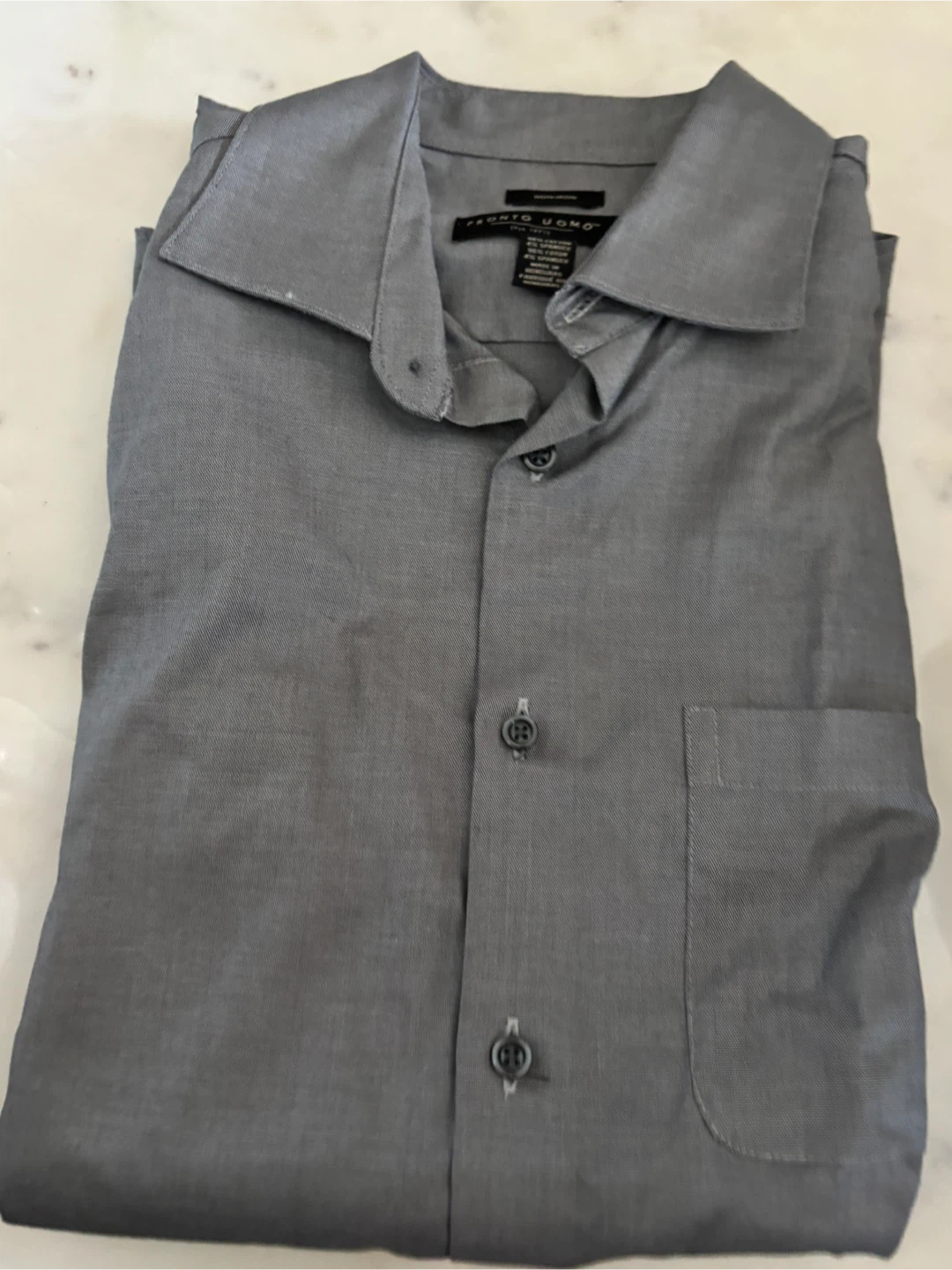 This is a grey Pronto Uomo dress shirt. It's a non-iron style, made with 60% cotton and 40% polyester. It's machine washable. This shirt is great for business casual or more formal events!