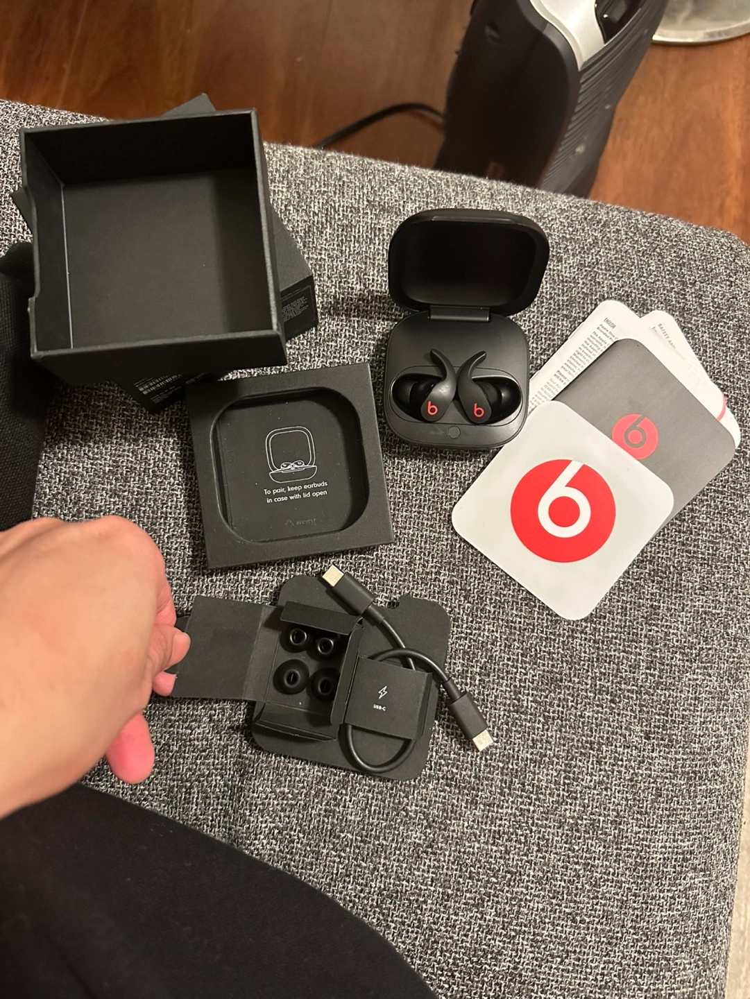 Wireless earbuds, comes with charging case, charging cable, and extra ear tips. Includes all original packaging.