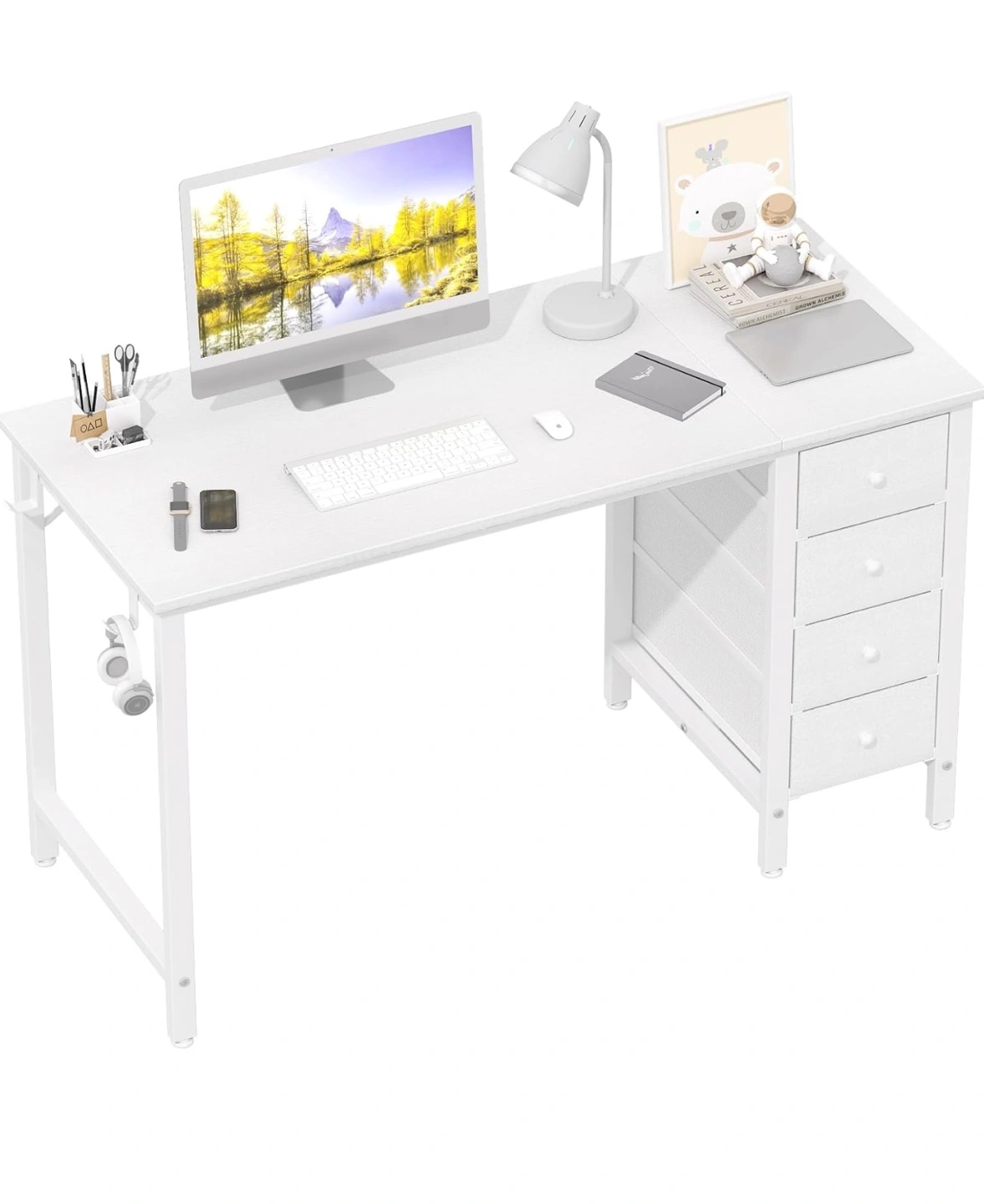 White computer desk with four drawers. Features adjustable leg pads, a heavy duty metal design, and a waterproof surface.