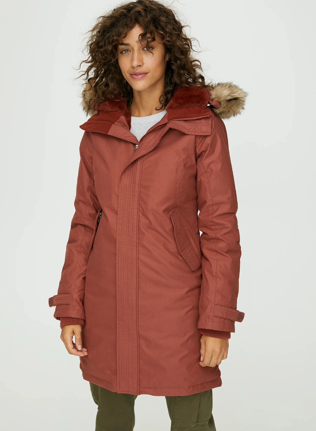 _ Content: 57% biconstituent fibre polyester nylon, 43% polyester; Coating: 100% polyurethane; Faux fur lining: 100% polyester; Sleeve & lower body lining: 100% polyester; Cuffs: 80% merino wool, 20% nylon; Fill: 80% goose down, 20% goose feathers; Detachable faux fur trim: 46% modacrylic, 37% acrylic, 17% polyester