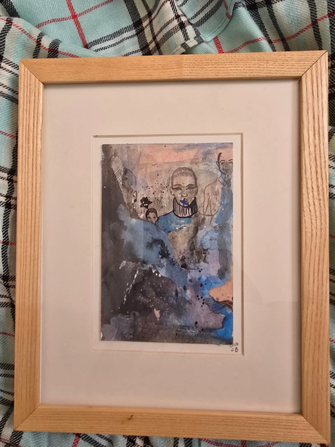 1000+Wooden frame with a watercolor painting inside. The painting is of faces with blue and black colors. giving away because maybe someone can give it some love at thier home ♡♡♡