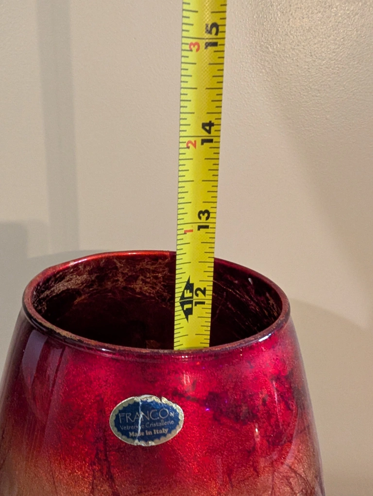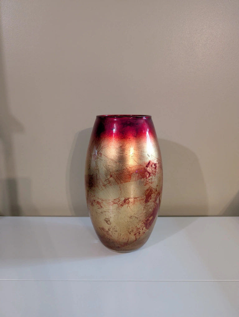 242Red and gold glass vase. Measures approximately 13 inches tall.