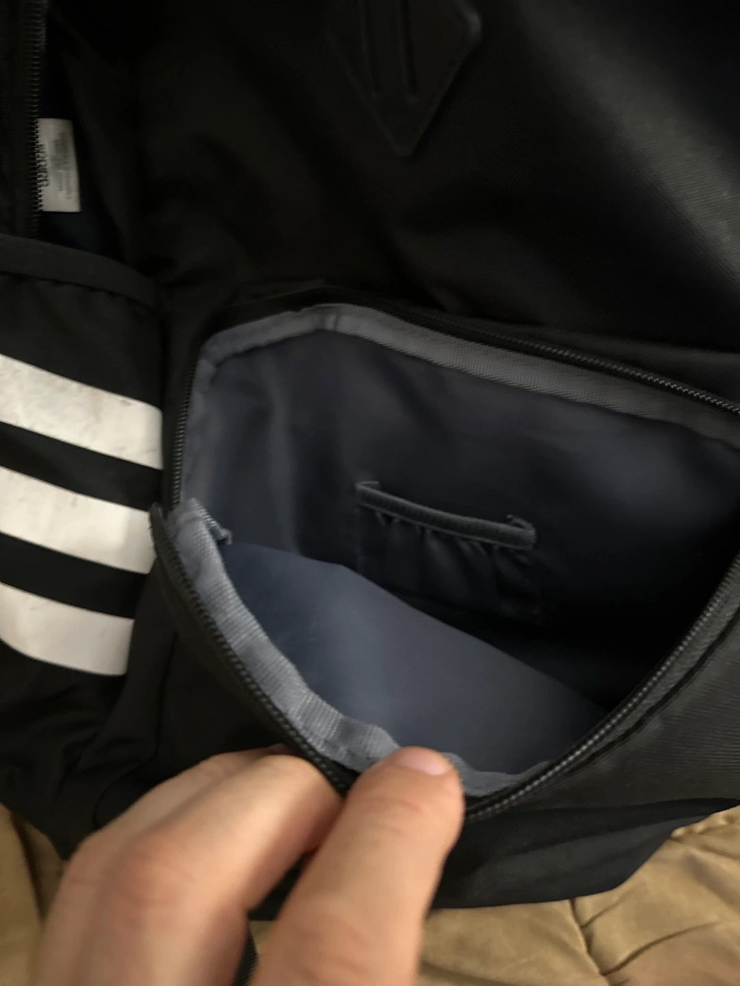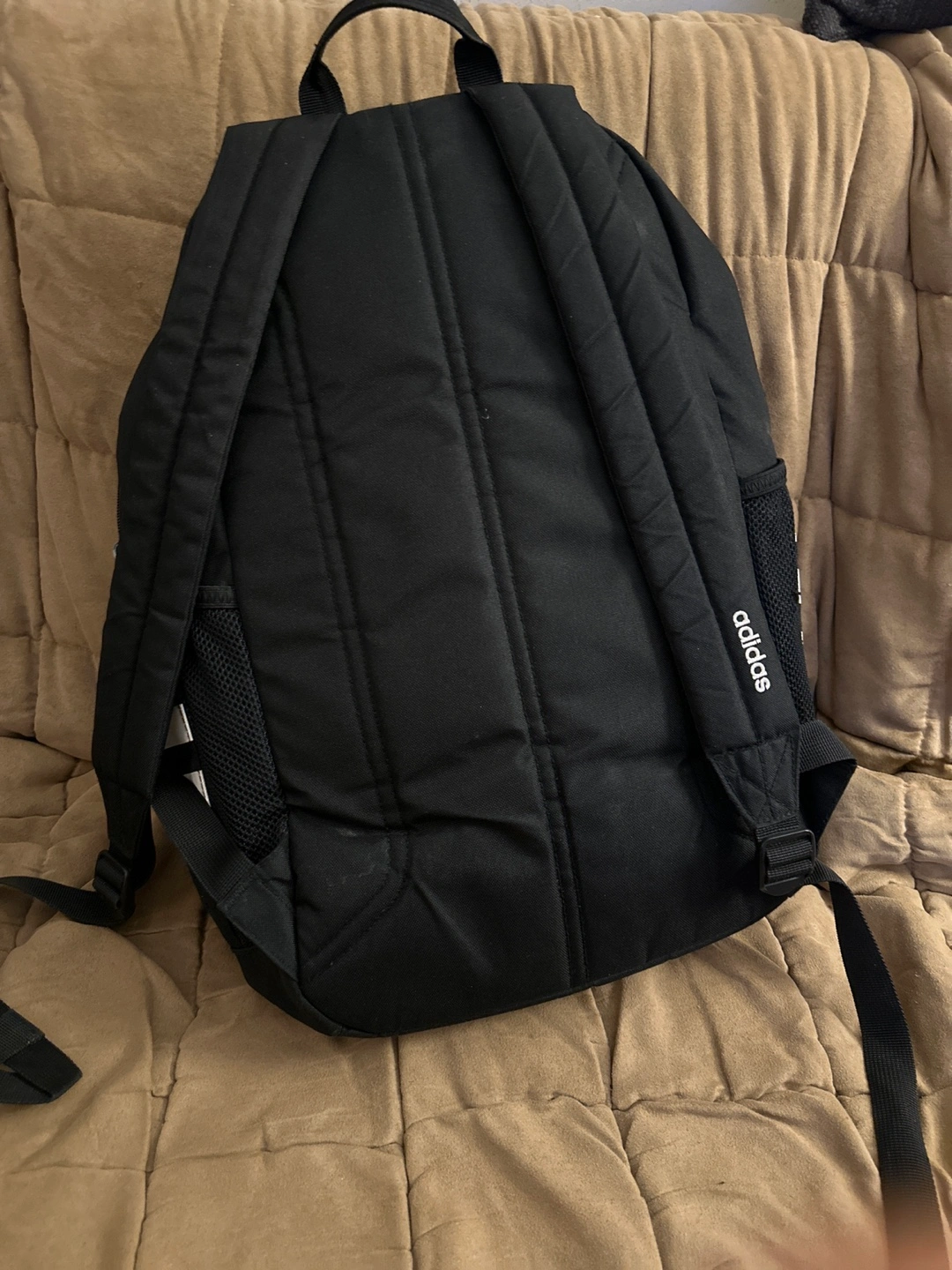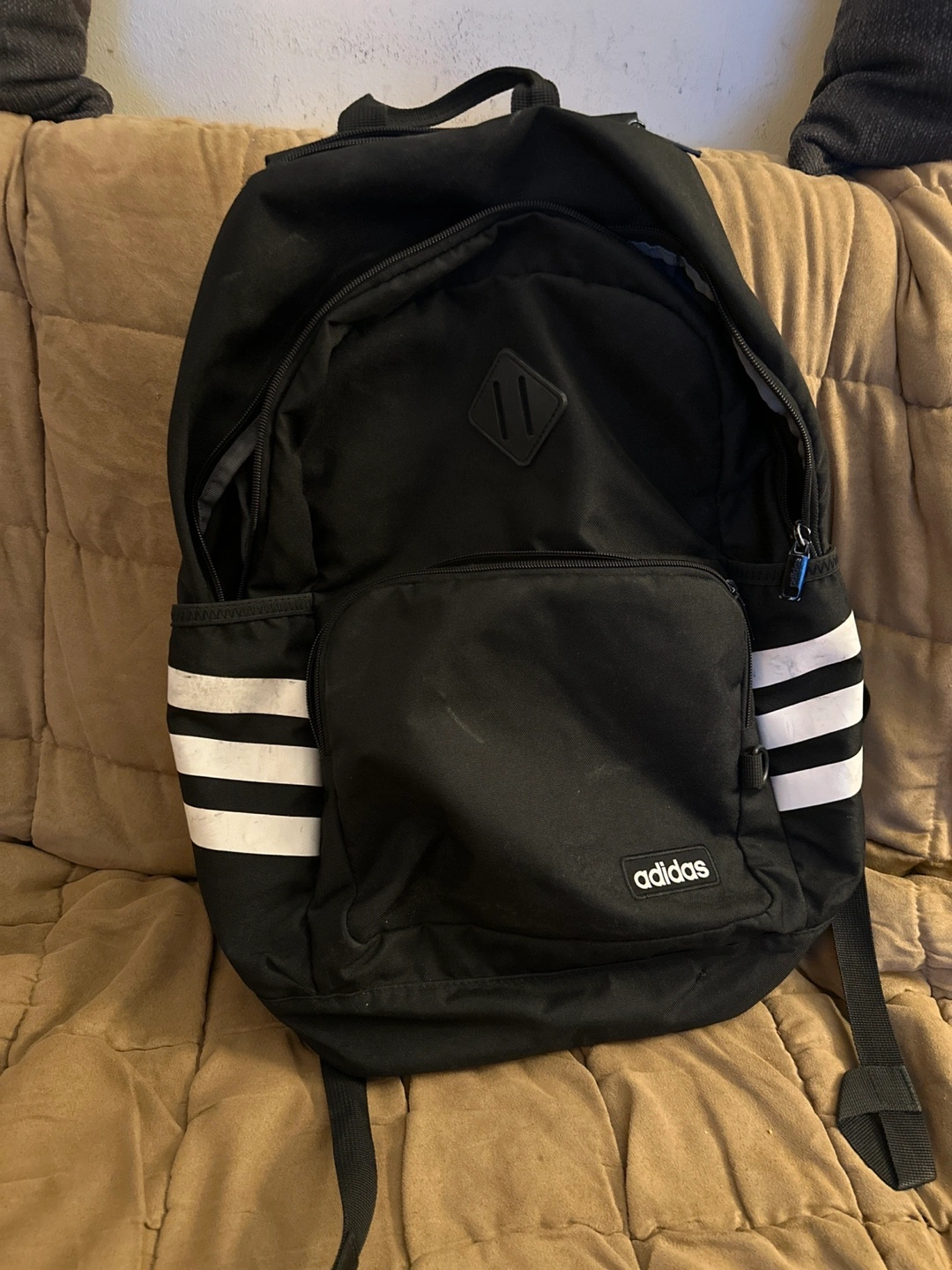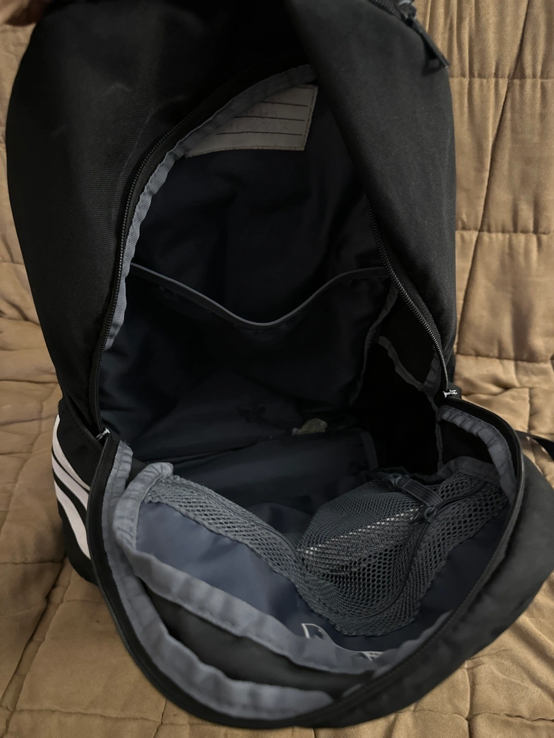 283Black Adidas backpack with white stripes. Features a front pocket and a small interior pocket. Backpack has a mesh pocket on the inside.
