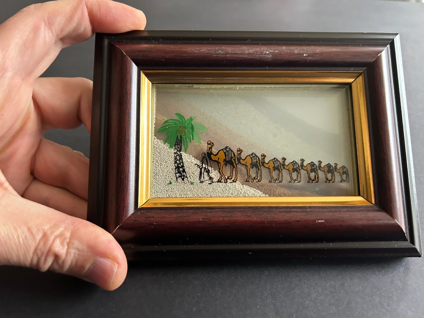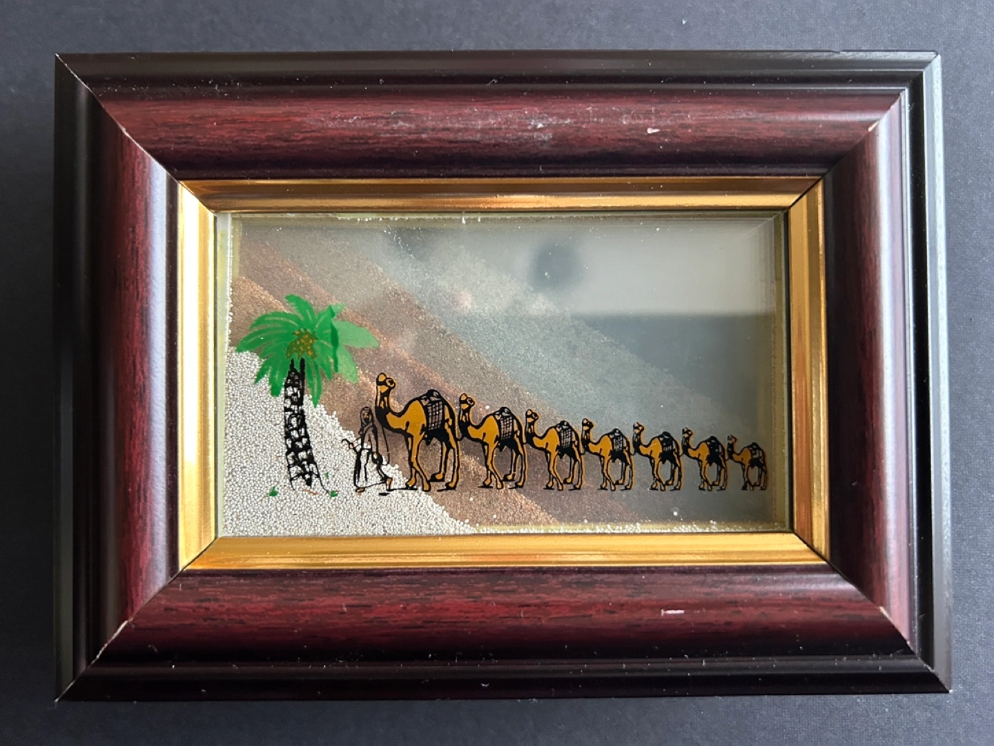Framed sand art featuring a camel caravan and a palm tree in a desert setting. The sand is collected from seven different emirates of the United Arab Emirates. The artwork comes in its original packaging and features a label with the title "Memories Unperished".