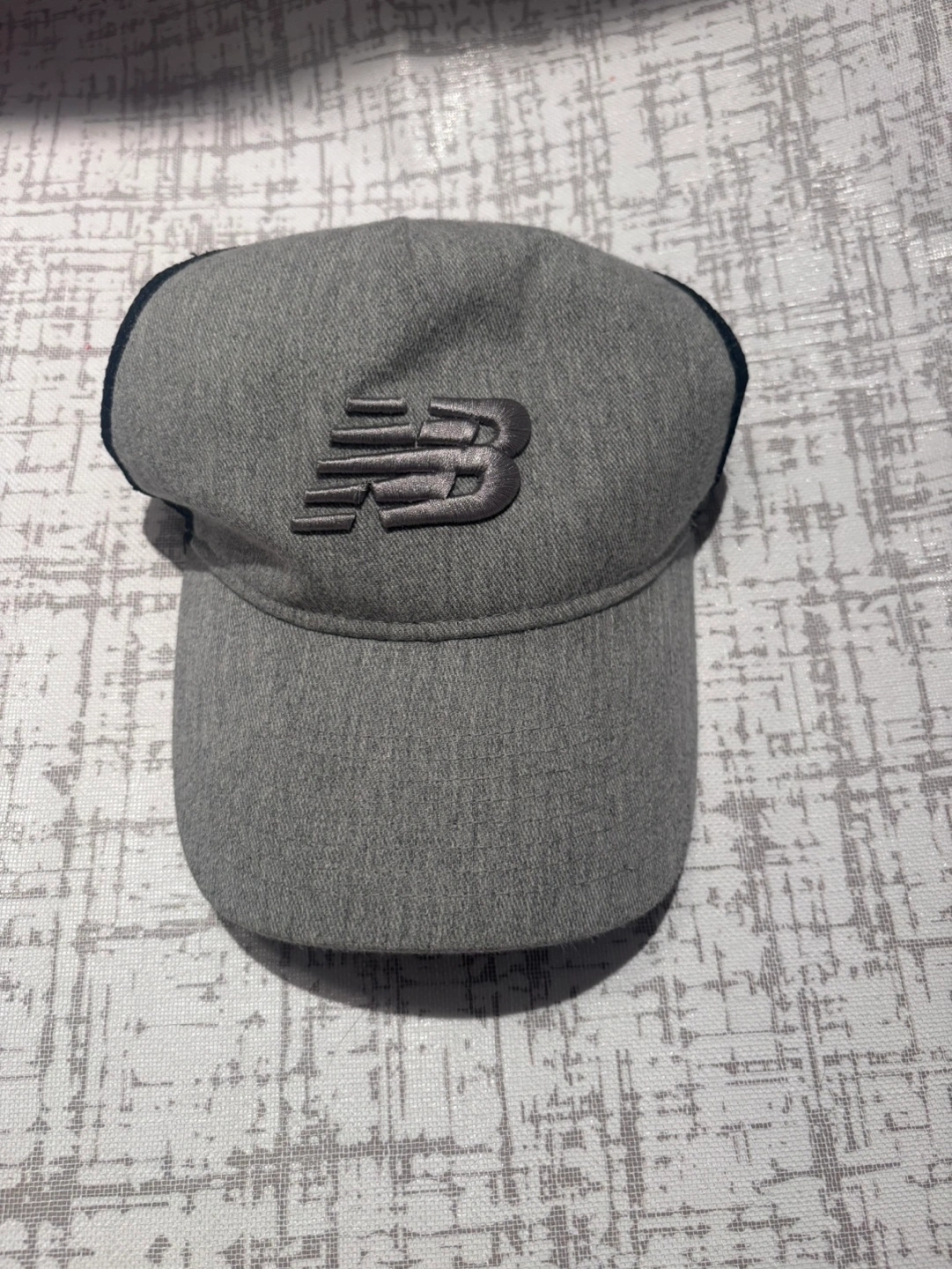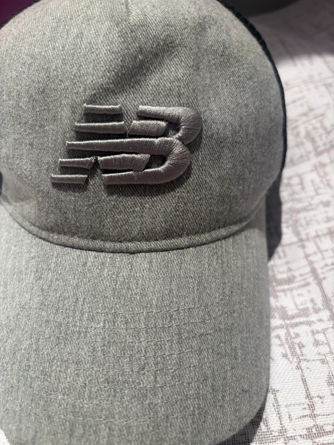 Grey and black mesh baseball cap with an adjustable back strap. New Balance logo embroidered on the front.