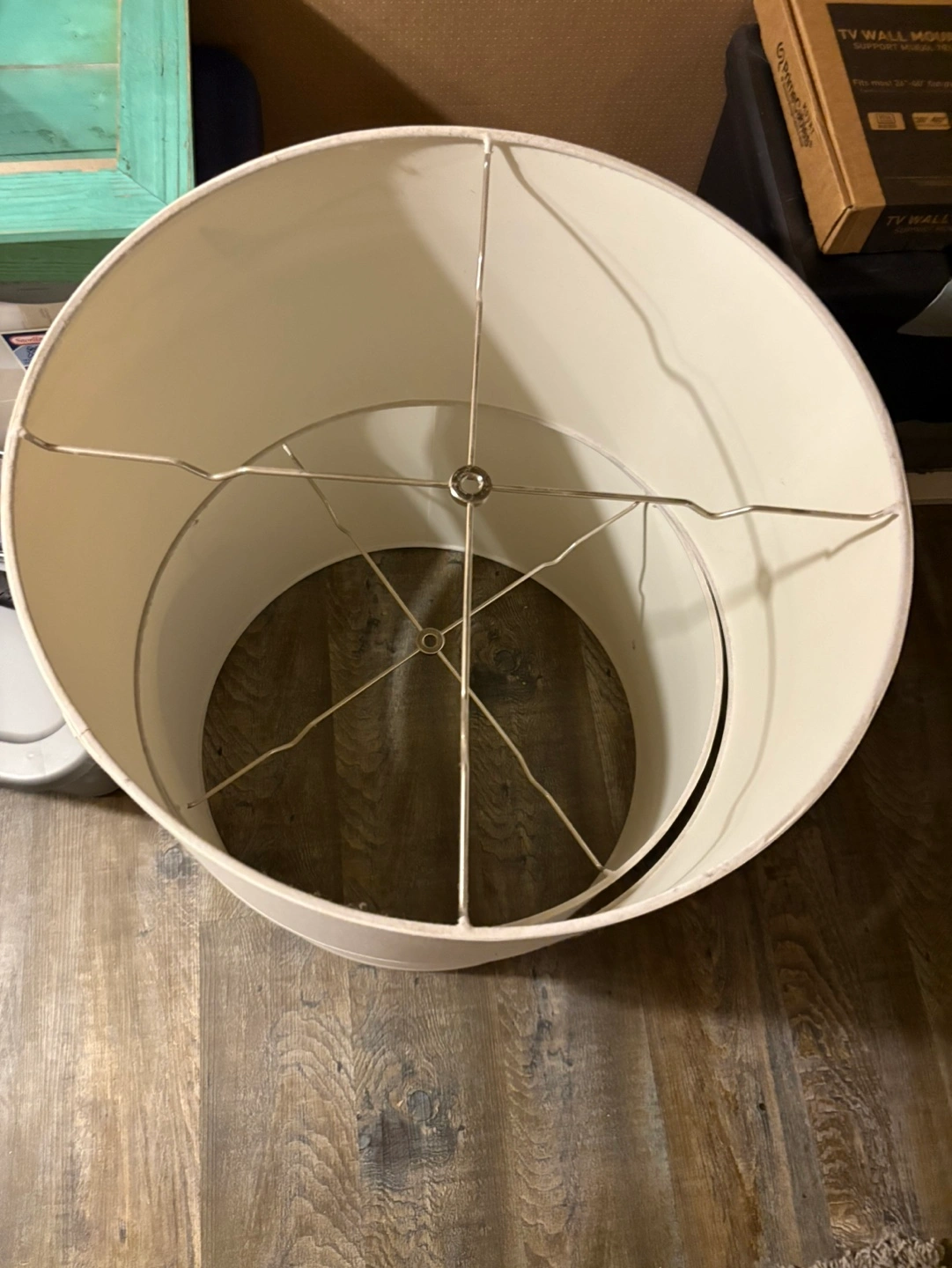 20Large white drum lampshade. Measures 19 inches in diameter and 11 inches tall. It has a metal frame. Comes with two shades.