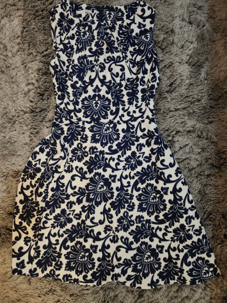 A Sleeveless dress with a floral pattern. The dress has a back zipper.