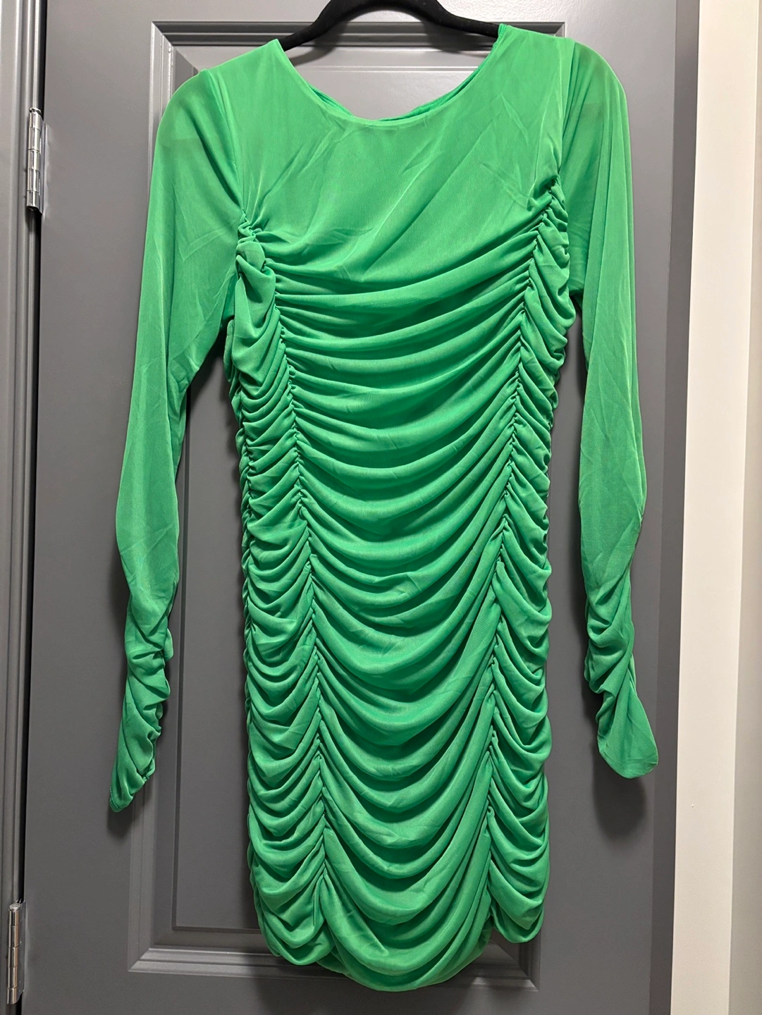 Green mini dress with long sleeves. Ruched throughout. Brand new with tags.
