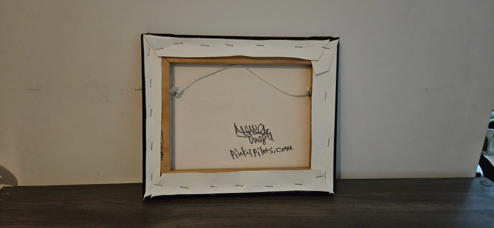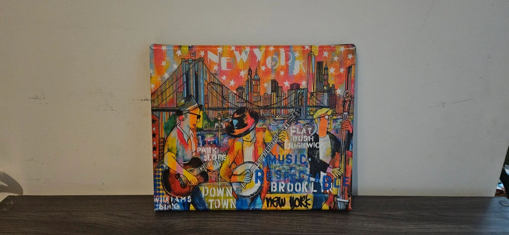 Canvas painting with a New York City theme. The painting features the Brooklyn Bridge, the city skyline, and two musicians. Signed in the back.