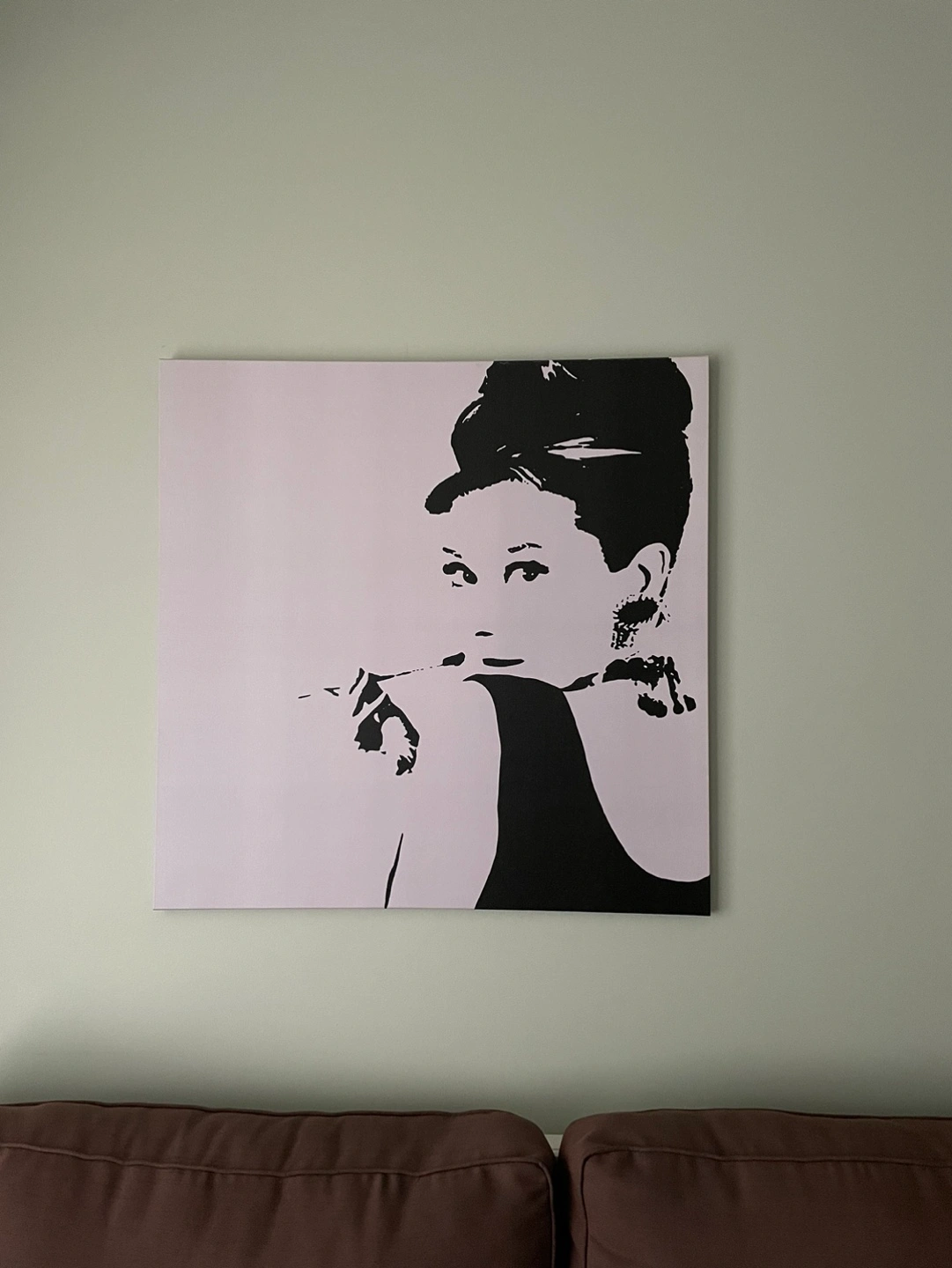 Black and white (slight purple hue)print of Audrey Hepburn on canvas. Perfect for any home decor enthusiast.