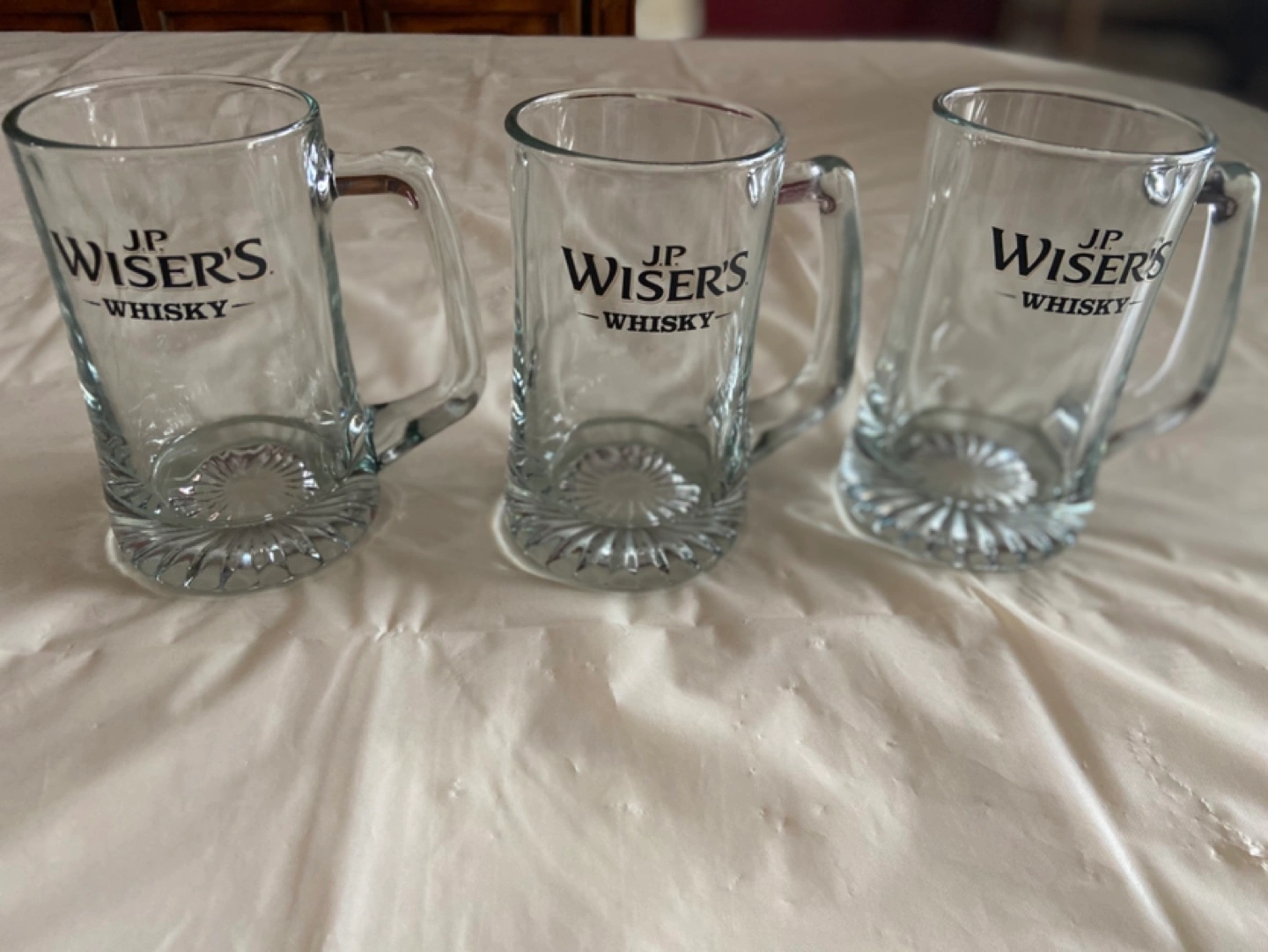 Glass mugs (3) branded with JP Wiser’s Whisky. Holds 14oz / 400 ml (not quite 2 cups). New, never used.