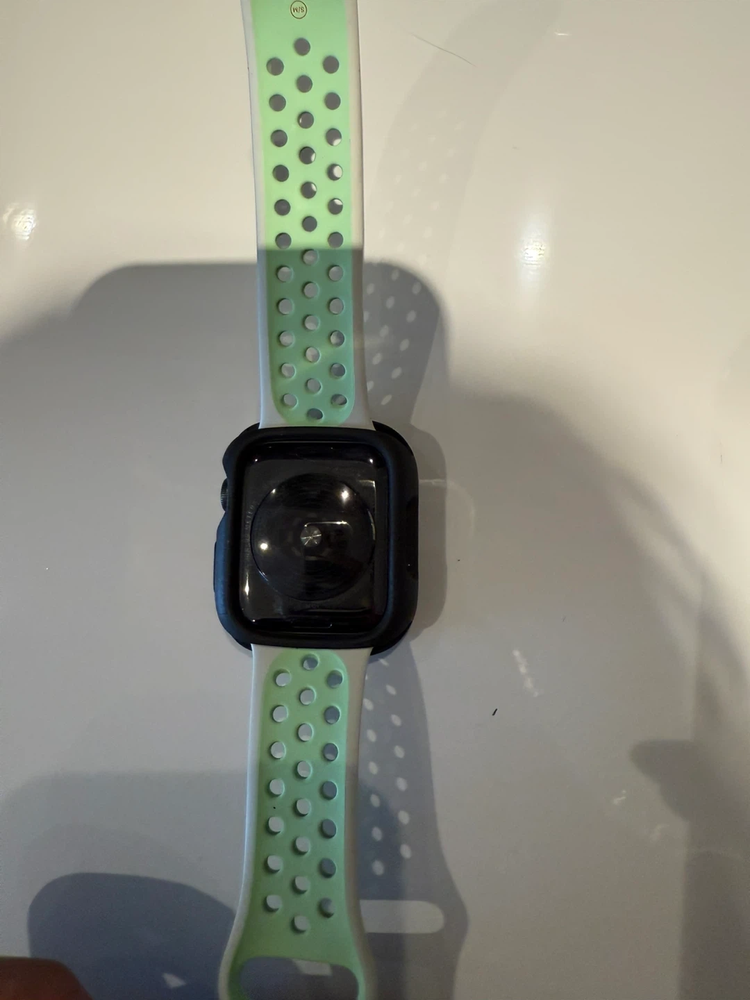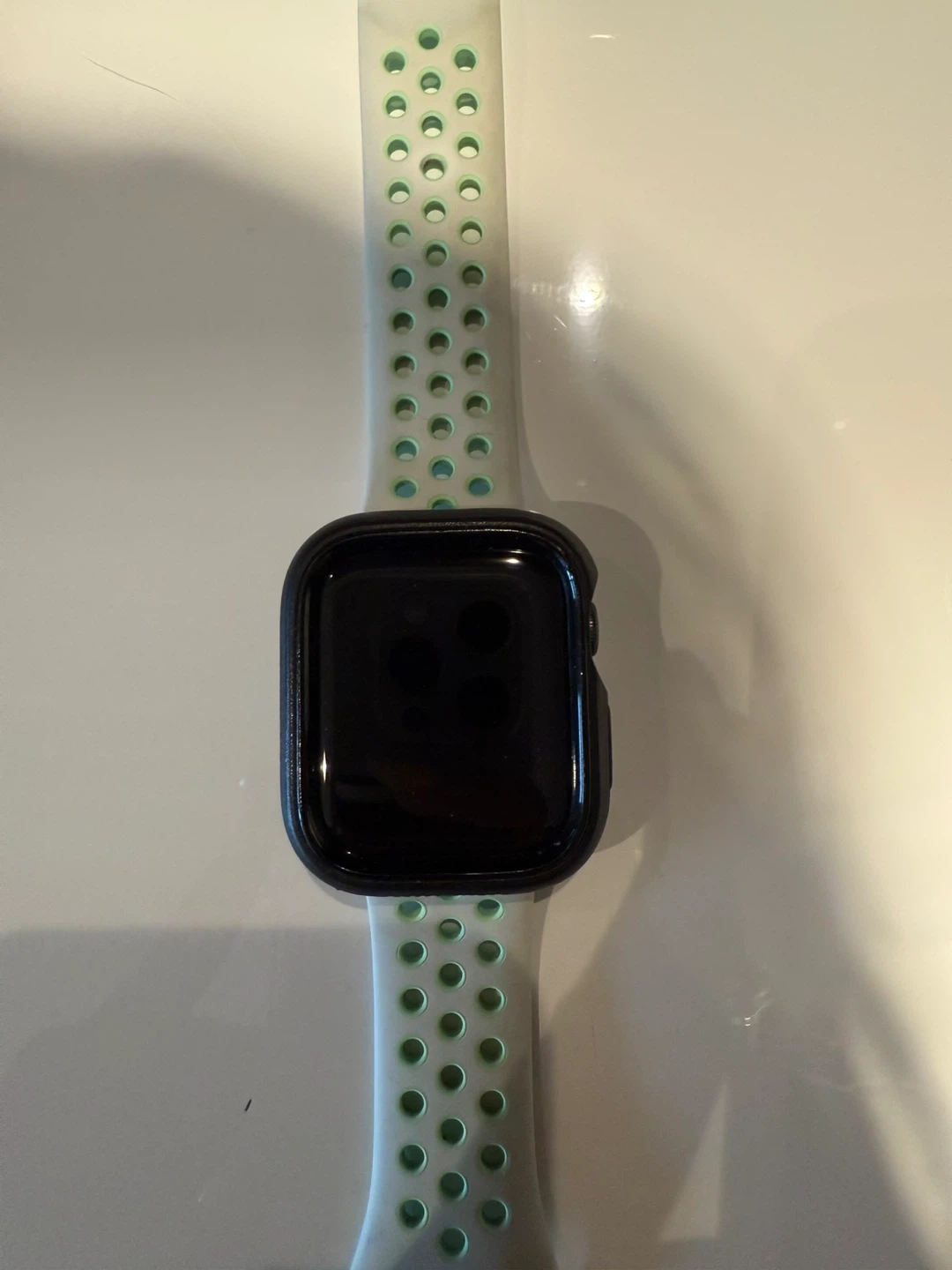 Selling an Apple Watch SE Nike edition paired with a Nike Sport Band. The band is a light green colour with a perforated design. It's lightweight and portable, perfect for workouts or everyday wear.