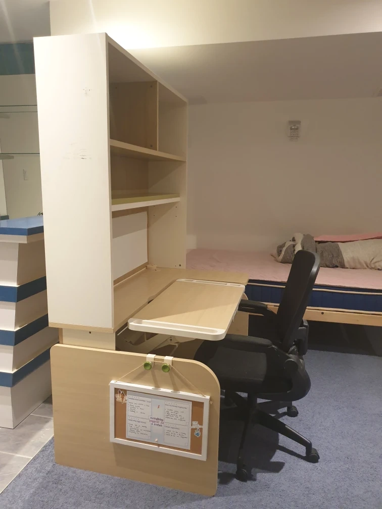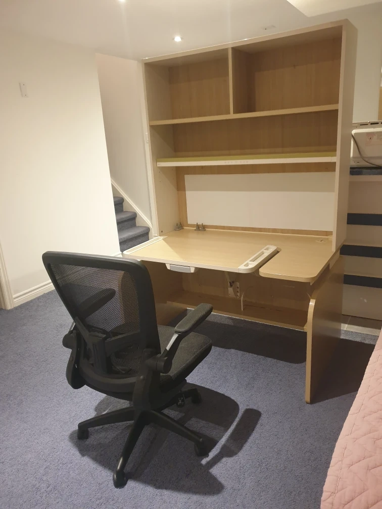Adjustable height desk with hutch. The desk features a large work surface, built-in shelves, and a pull-out keyboard tray. The desk can be easily adjusted to your desired height, making it perfect for both sitting and standing. The desk has been lightly used and is in excellent condition. No include chair.