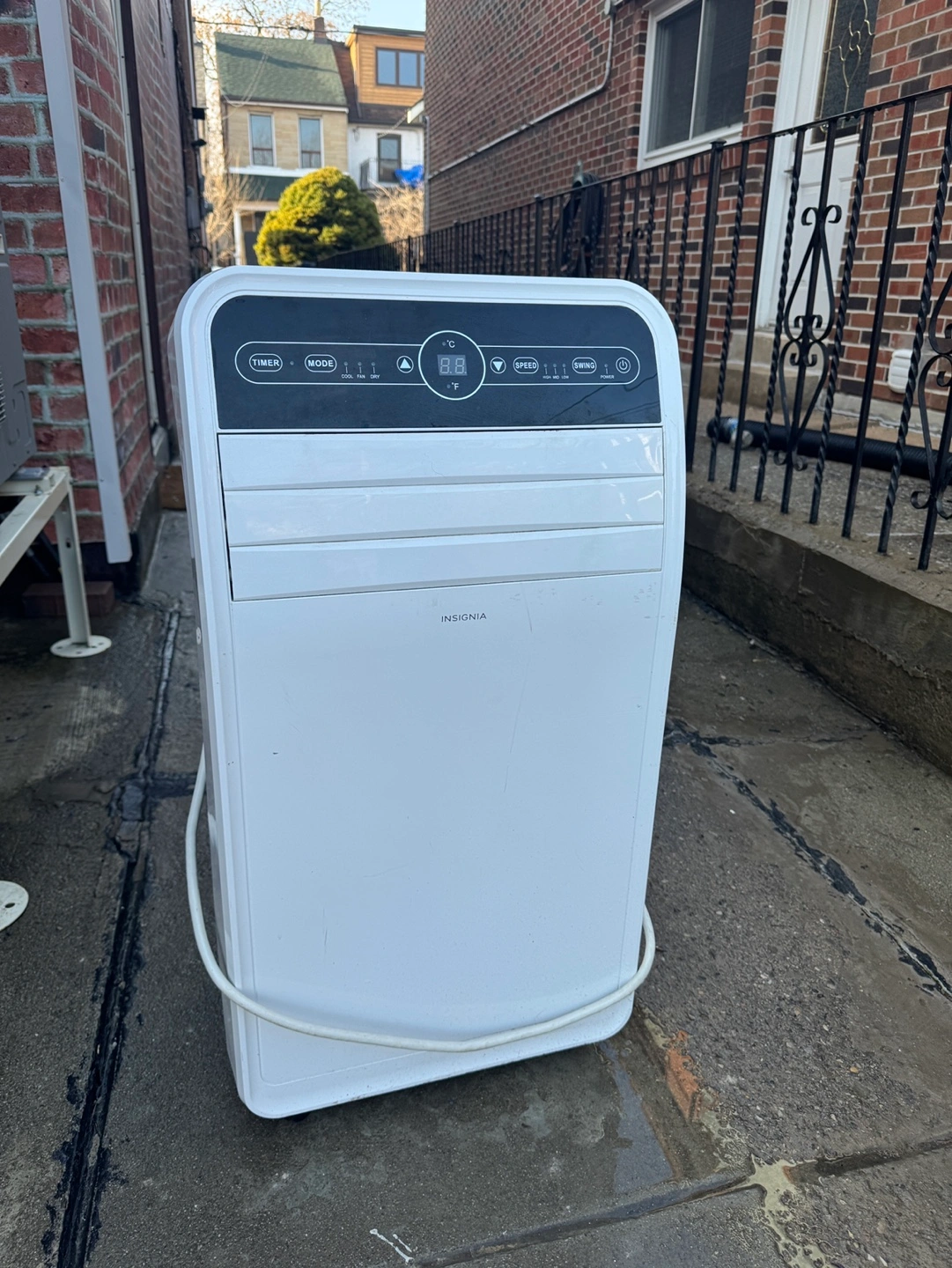 Portable air conditioner. White and grey. Has multiple fan speeds and modes.