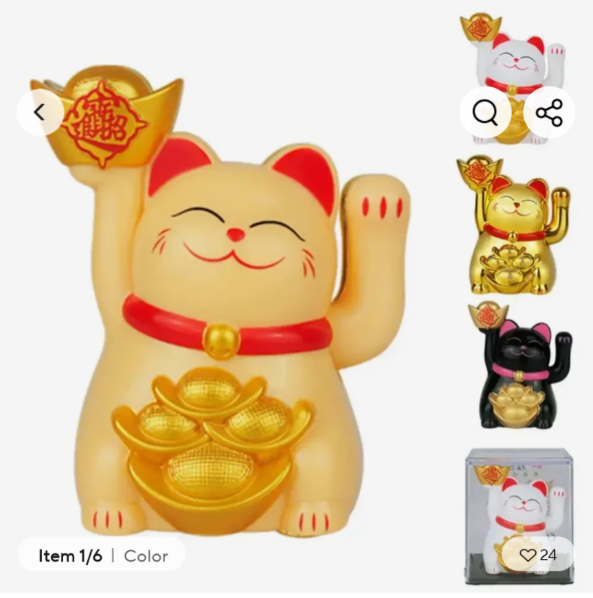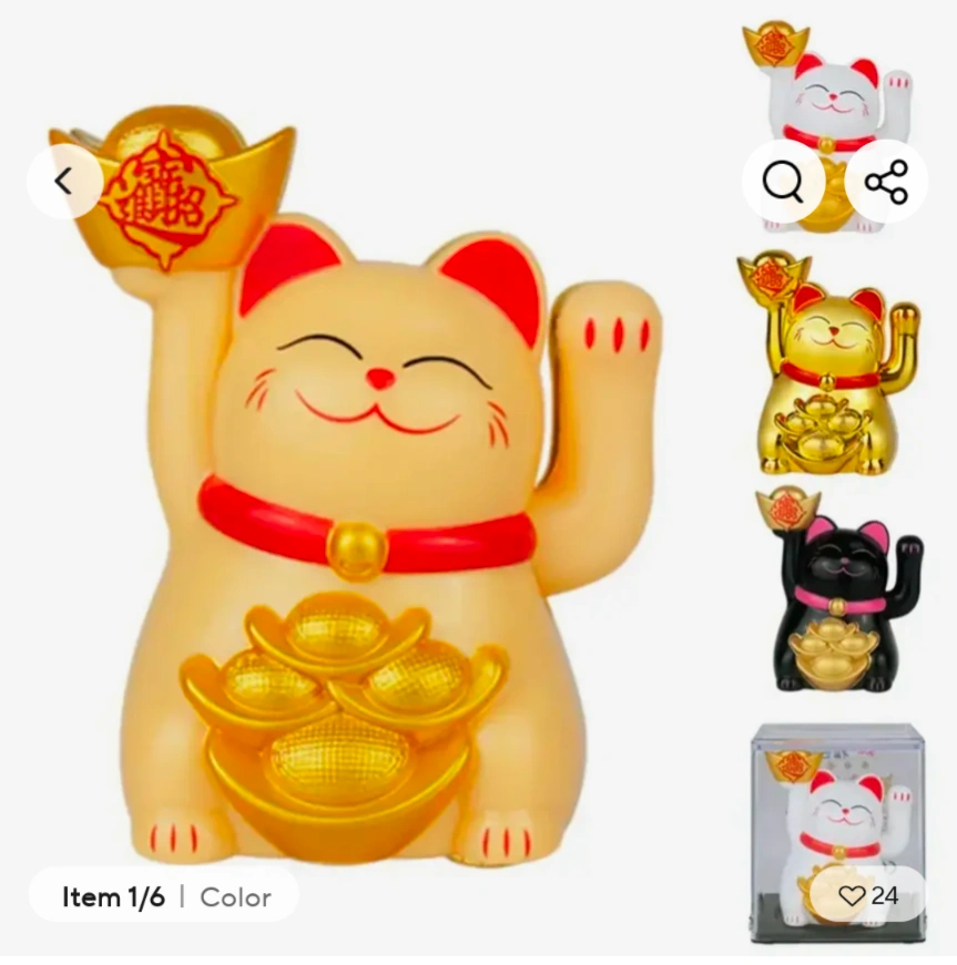 Gold and white Maneki-Neko figurine with a red collar and gold coins. The figurine's right paw is raised in a beckoning gesture.