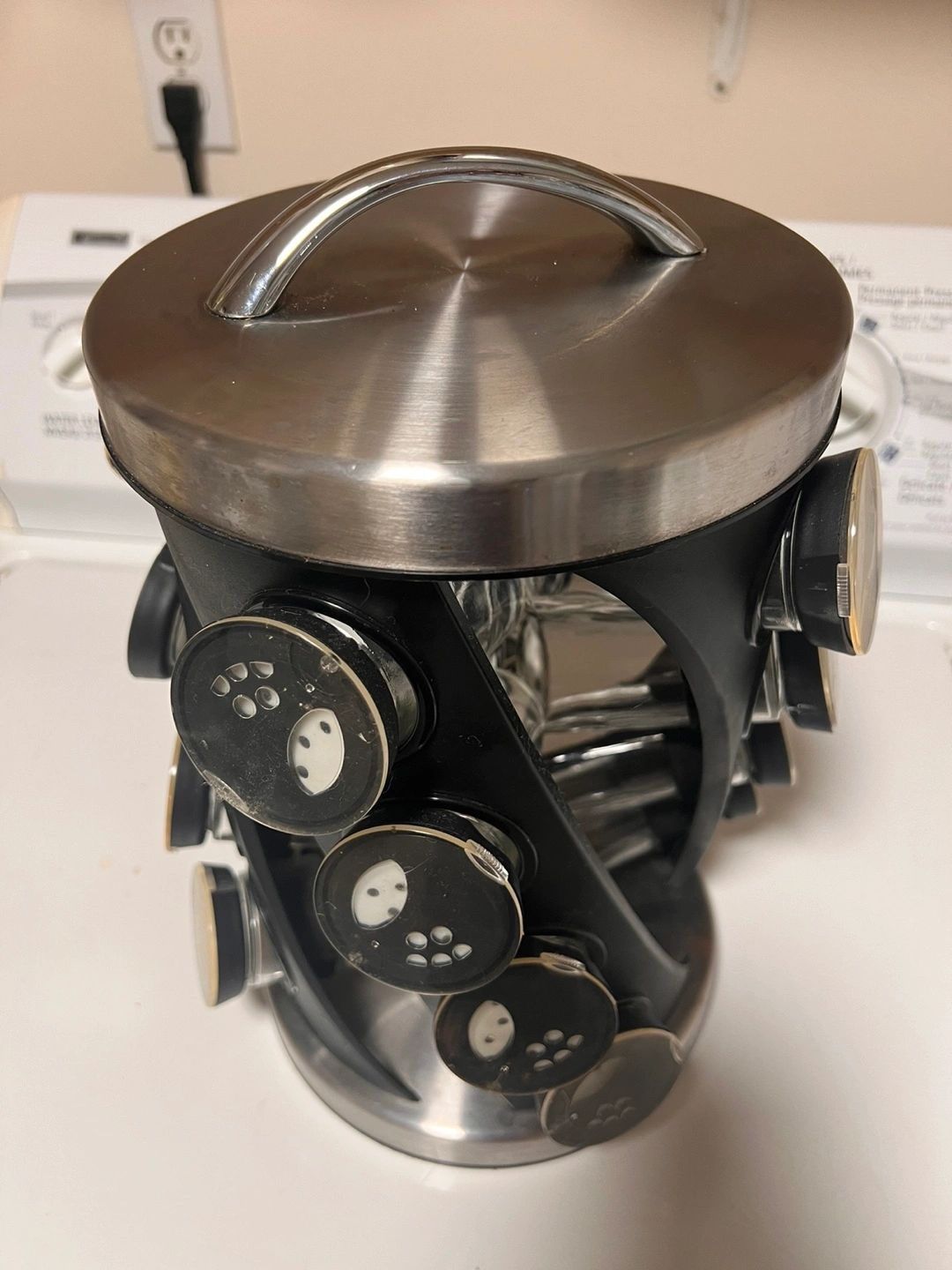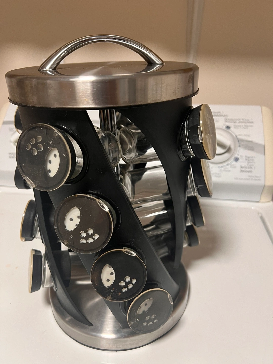 Rotating spice rack with 16 glass jars. Made of stainless steel and black plastic. Clean and stored for months in the storage. I don’t need it anymore.
