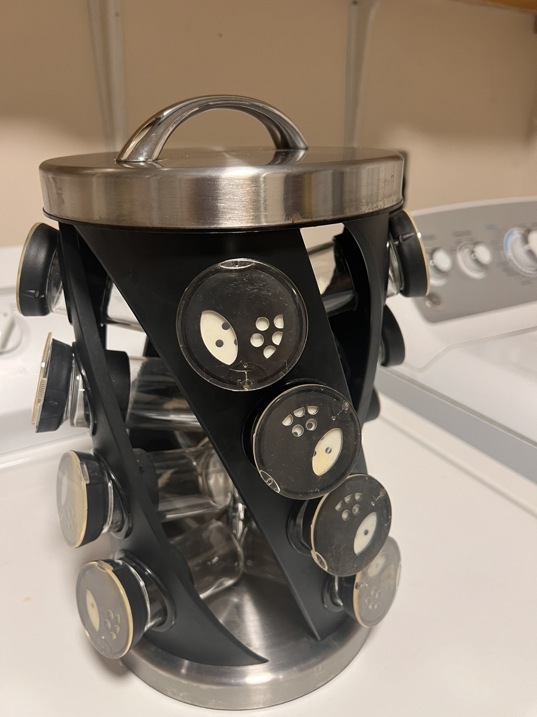 Rotating spice rack with 16 glass jars. Made of stainless steel and black plastic. Clean and stored for months in the storage. I don’t need it anymore.