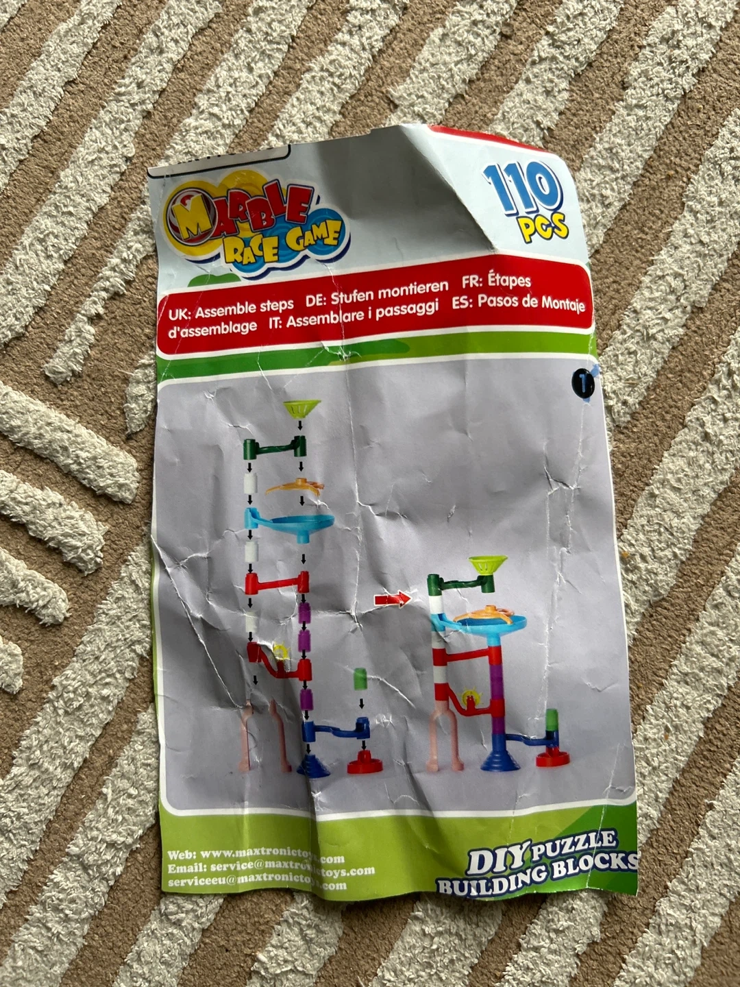 This set includes 110 pieces for building a marble race game. It's a DIY puzzle building block toy. It's great for imaginative play and creating complex marble runs! Comes with marbles