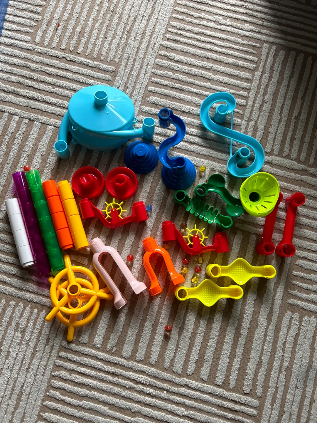 This set includes 110 pieces for building a marble race game. It's a DIY puzzle building block toy. It's great for imaginative play and creating complex marble runs! Comes with marbles