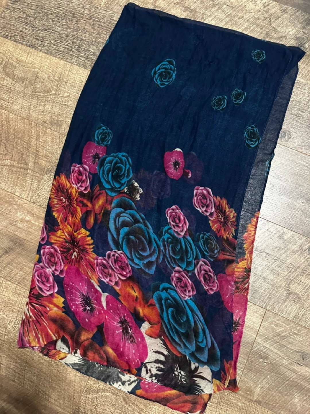 510Lightweight scarf with a floral print. Navy blue background with various coloured flowers, including roses. Self pickup at Coquitlam Parkway Blvd