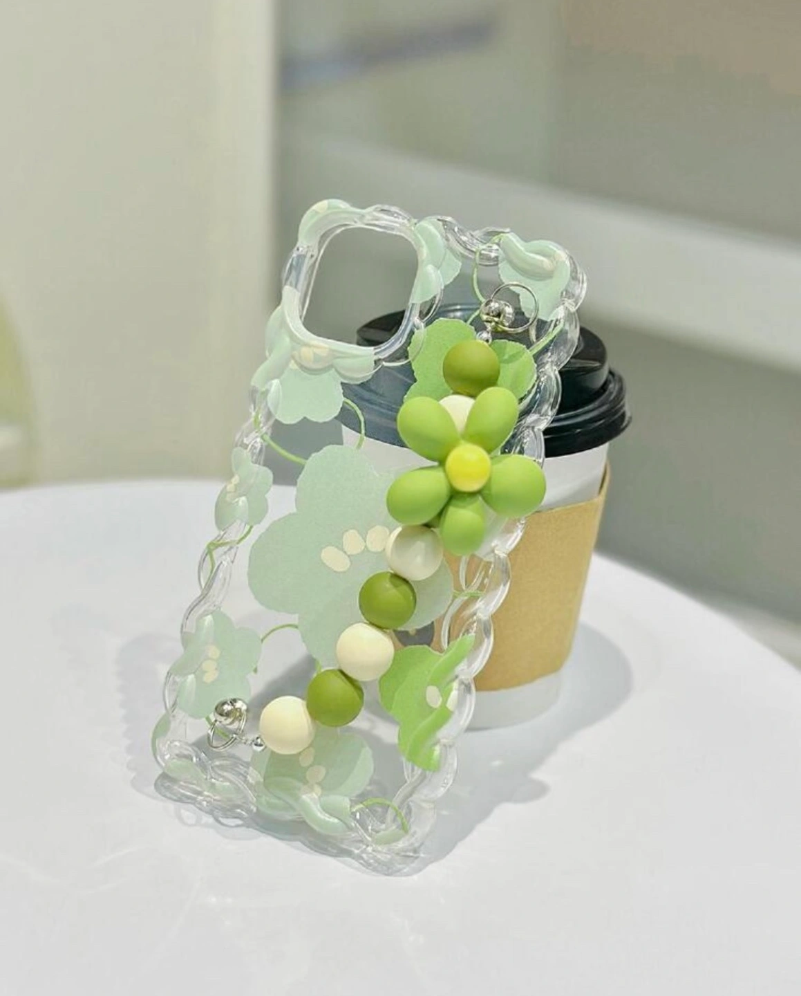 Clear phone case with green floral design. Features a beaded charm with a green flower.