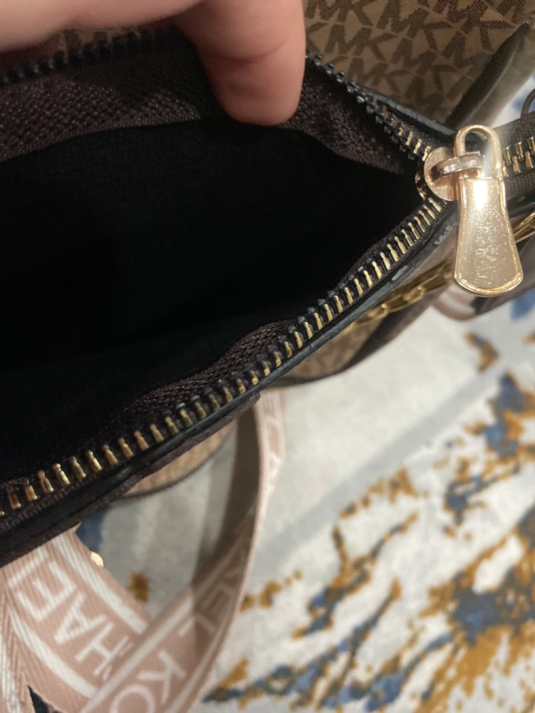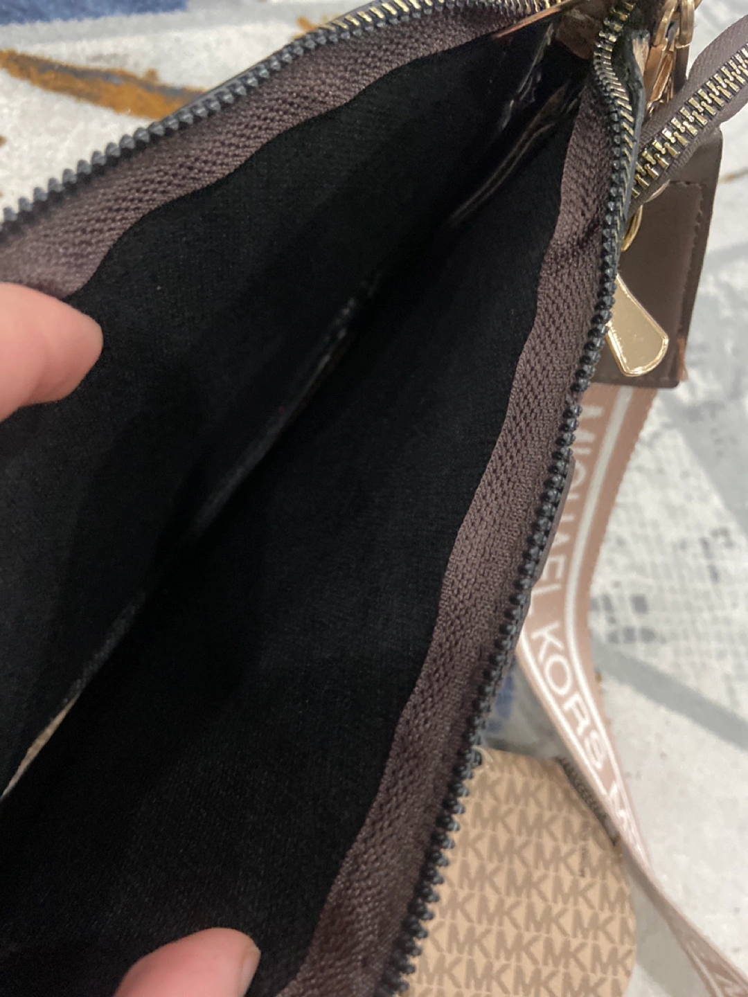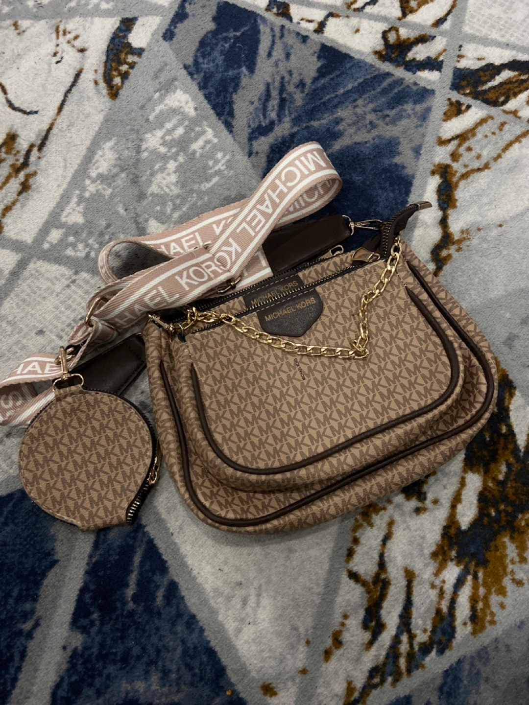 Brown and tan Michael Kors crossbody bag with chain strap, matching coin purse, and adjustable strap. Comes with dust bag.