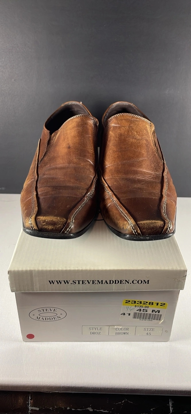 71Brown leather slip on shoes, size 45. Slight wear to leather. Comes with original box. Steve Madden size 45 equates to size 12 mens US sizing guide