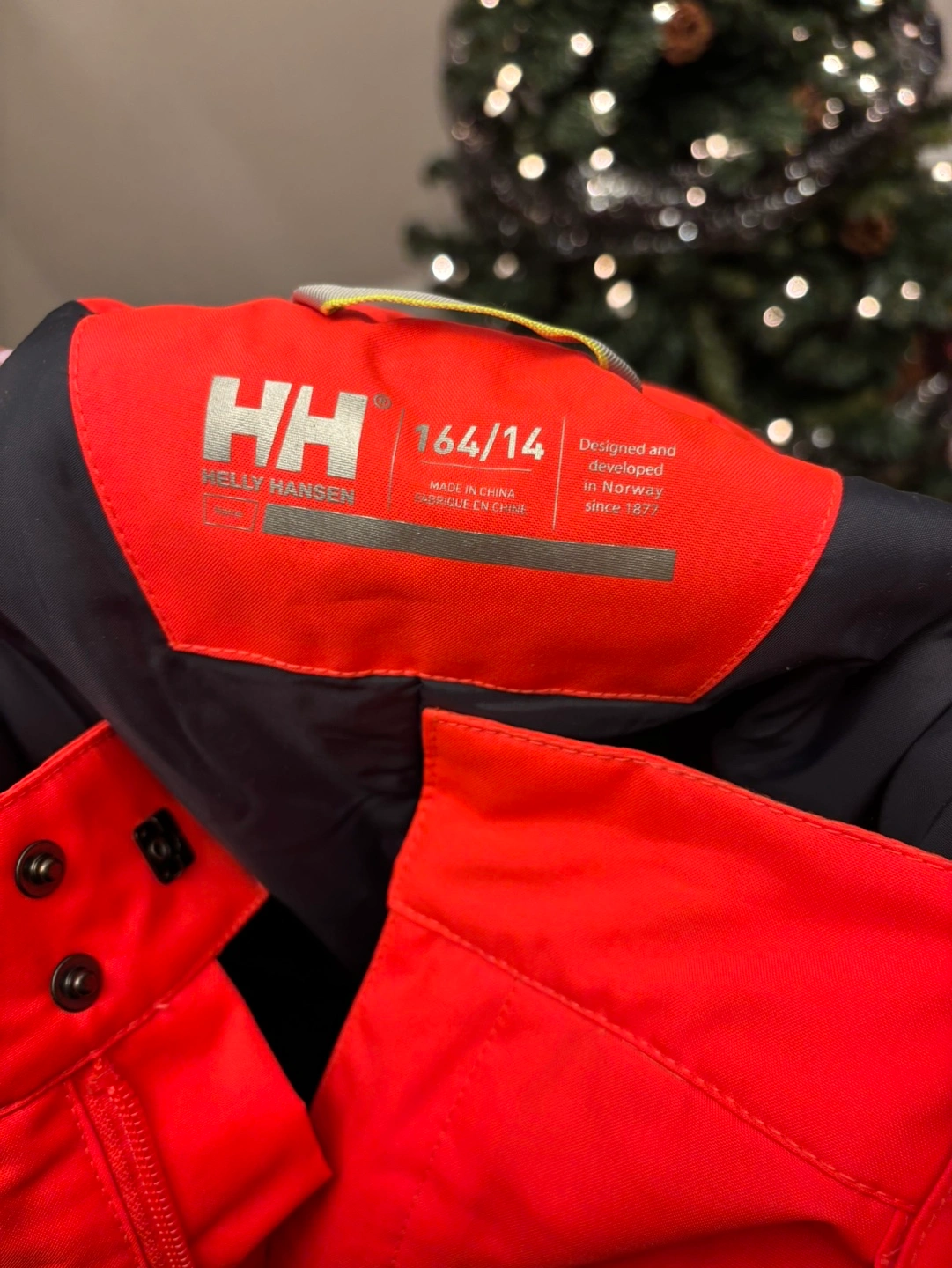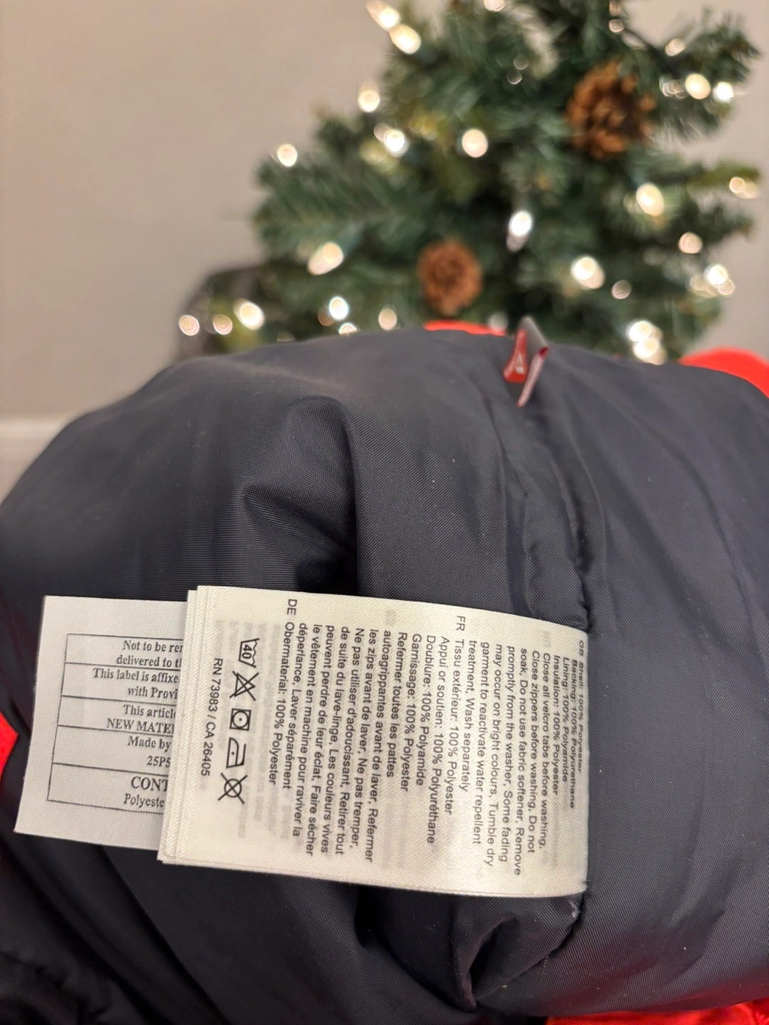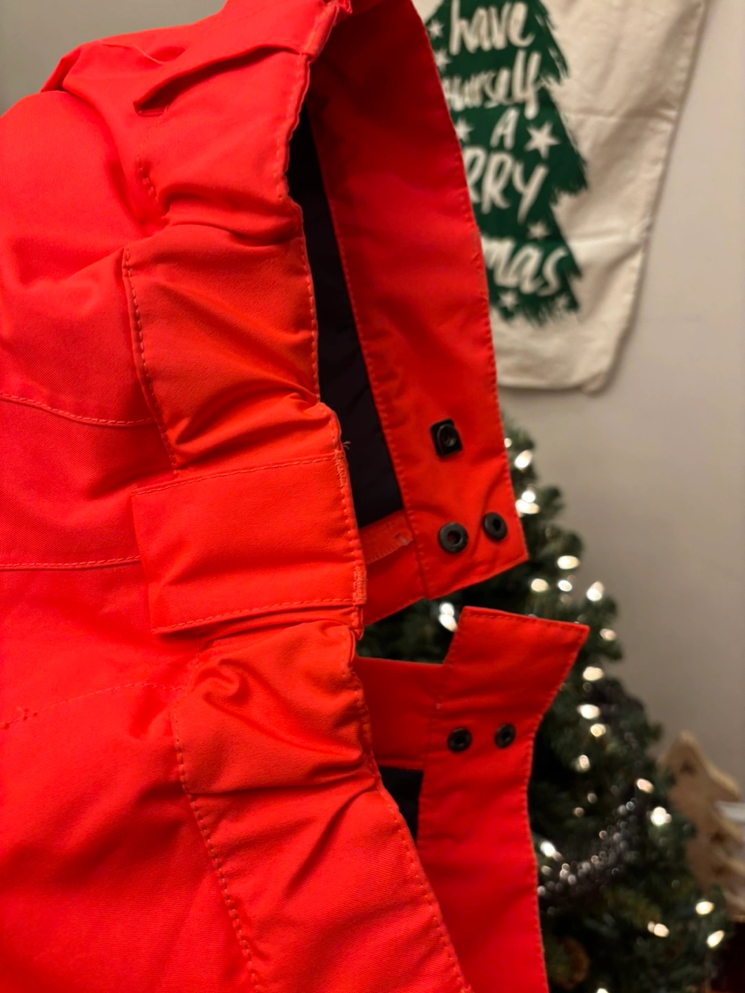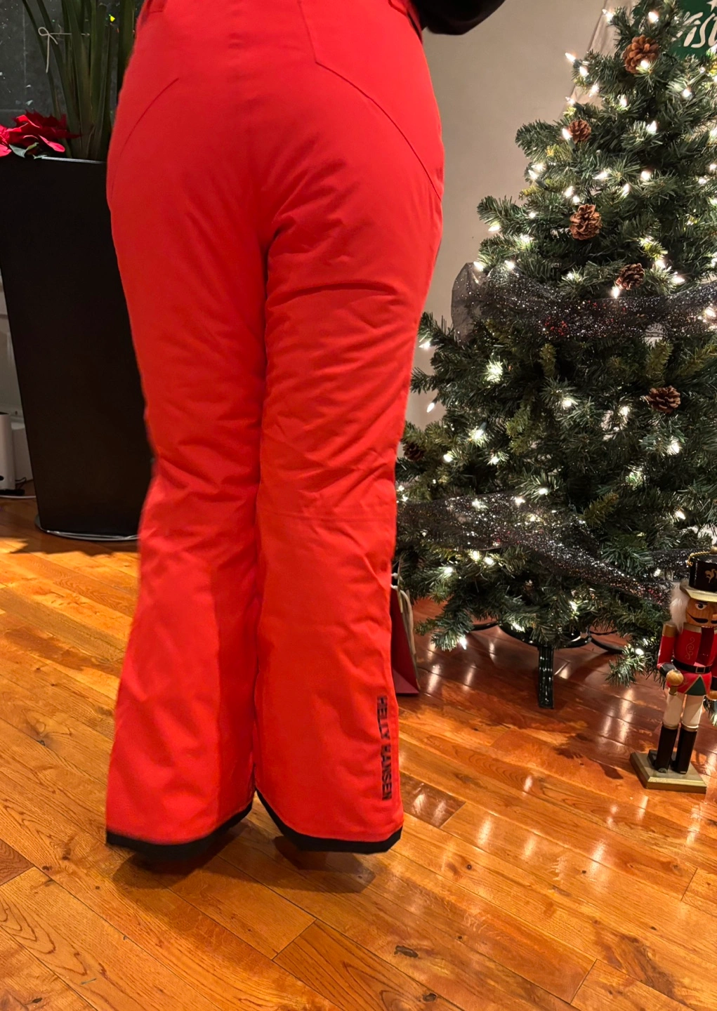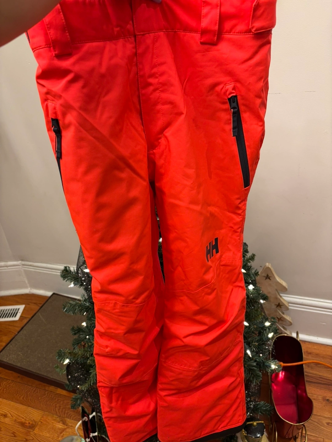Red ski pants with black accents and zippered pockets. Size 14/16. Model is 5’4. It fits better for children under 5’4.
