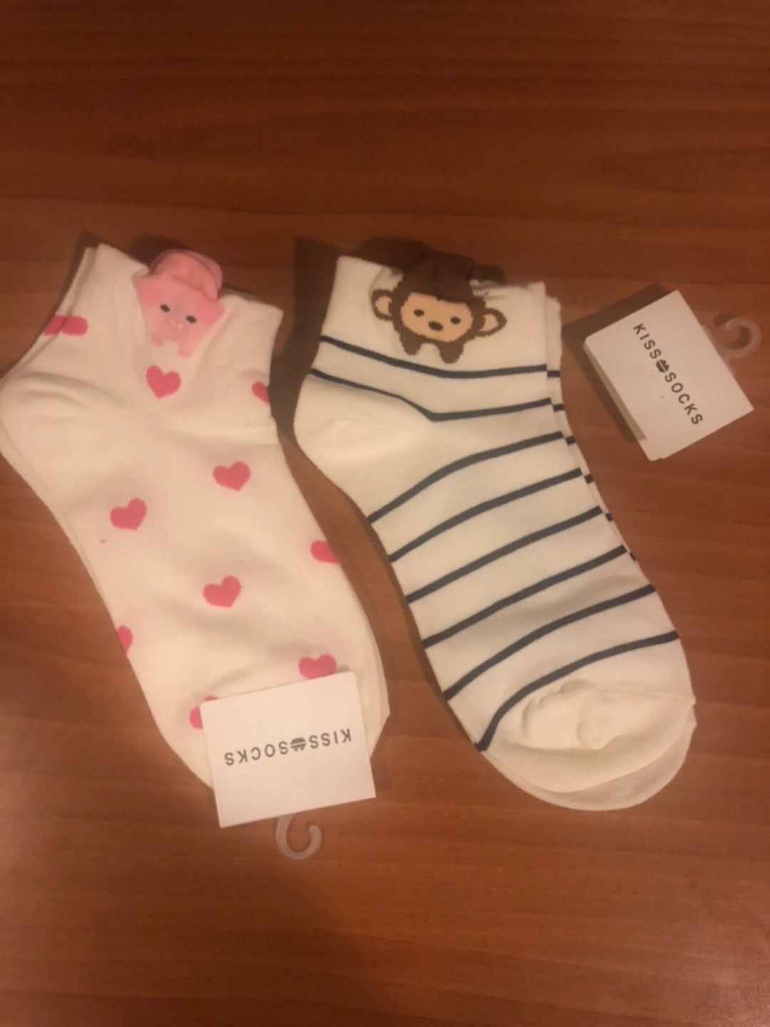 Two pairs of ankle socks. One pair has pink hearts and a pig on the top. The other has blue and white stripes and a monkey on the top.