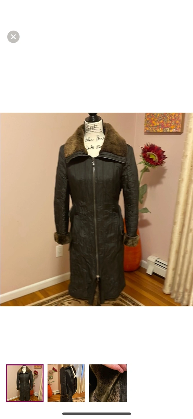 Long black winter coat with real fur trim on the collar and cuffs, inside Zipper closure and a belt.