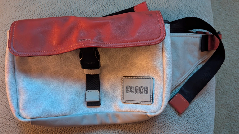 Pacer crossbody bag in signature canvas with Coach crest. Brand-new White and peach coloured fanny pack with black adjustable strap.
