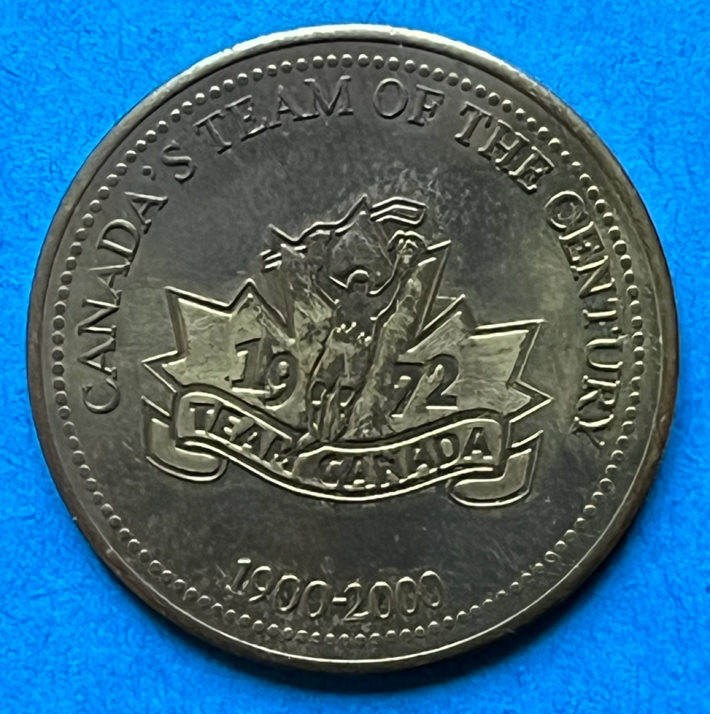 One side portraying 'Canada's Team of the Century' logo, and the back-side, an artist rendition of the moment Paul Henderson scored the winning goal.