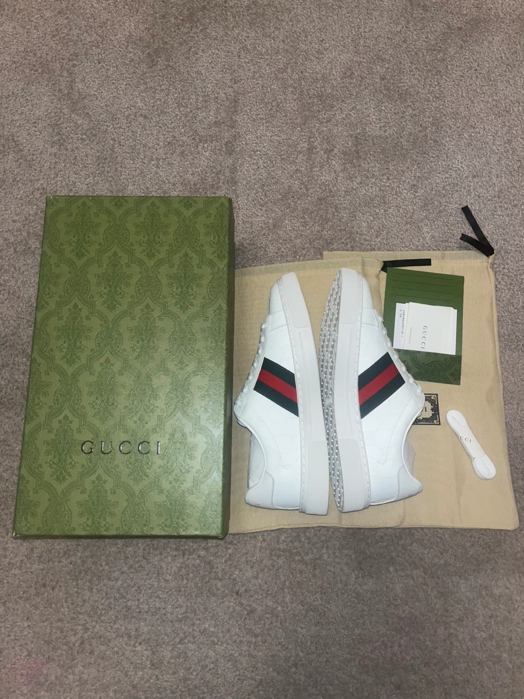 These are Gucci Ace sneakers in white leather. They feature the iconic green and red stripe detail. Includes original box, dust bags, and extra laces.