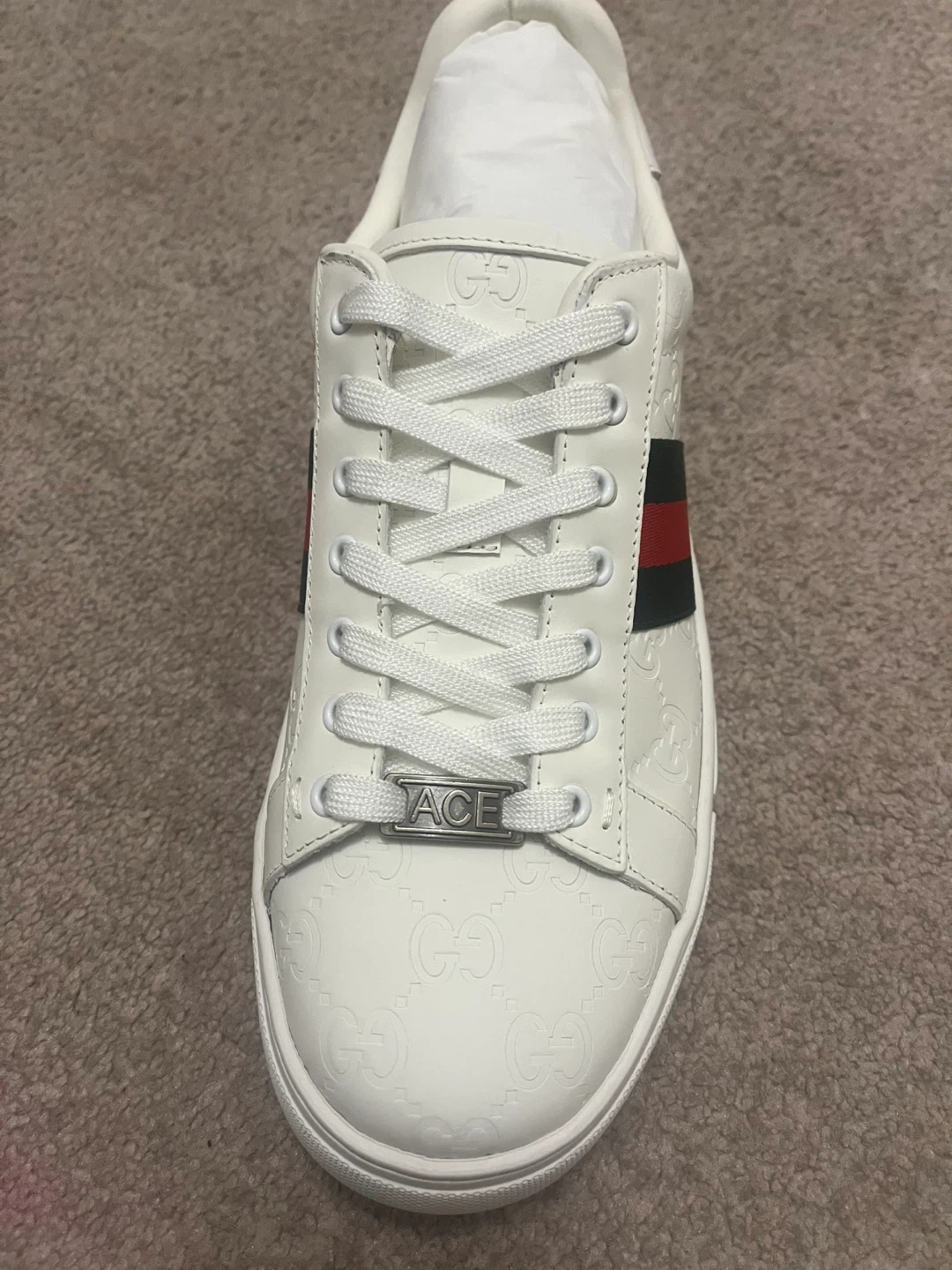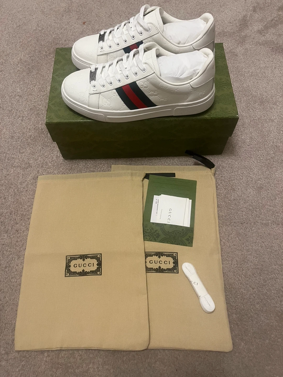 These are Gucci Ace sneakers in white leather. They feature the iconic green and red stripe detail. Includes original box, dust bags, and extra laces.